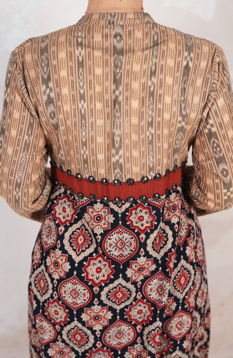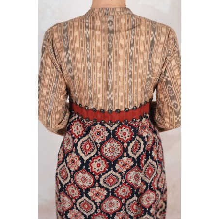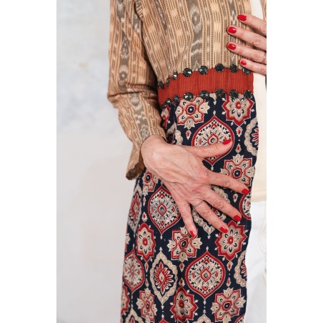 Il disegno del tessuto di cotone della gonna è realizzato con la tecnica manuale ajarak, un’eccellenza indiana, di origine pakistana.