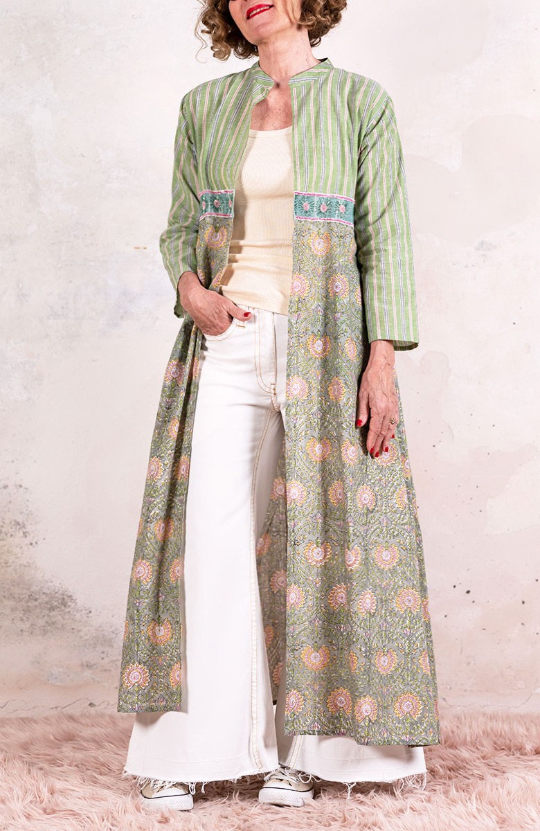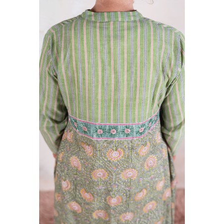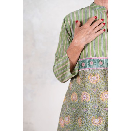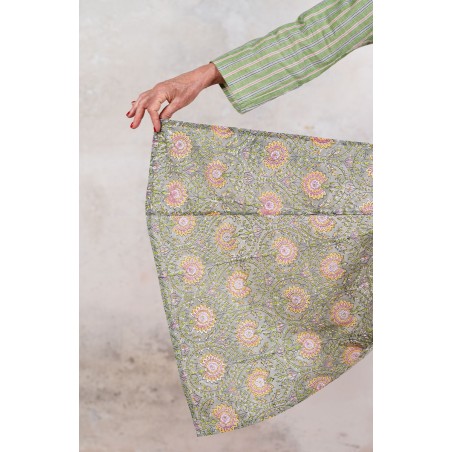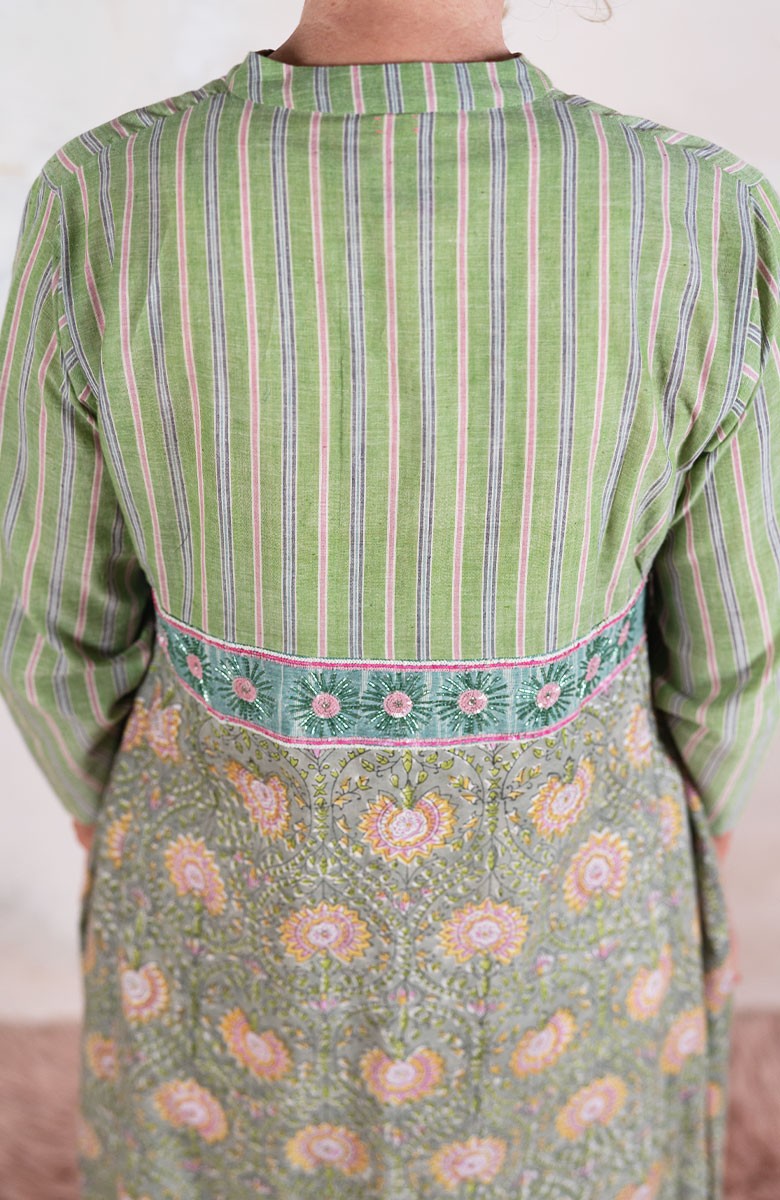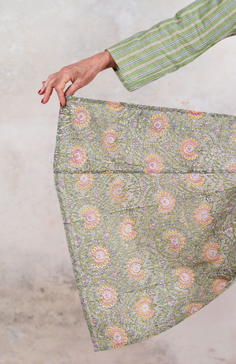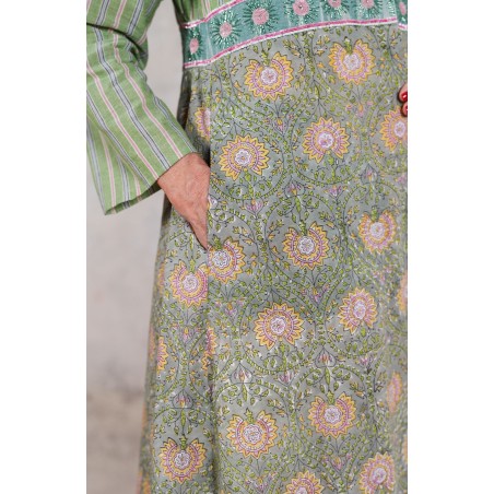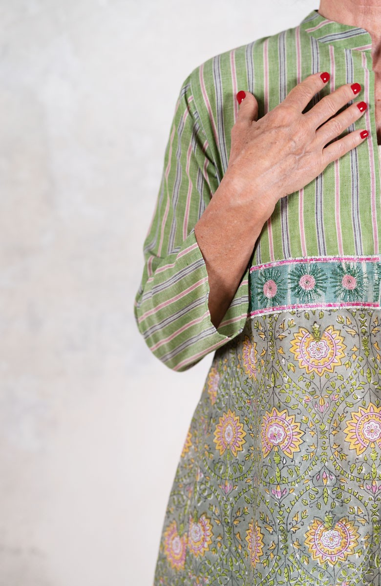 Il tessuto di cotone della gonna è stampato con la tecnica manuale block printing, un’eccellenza indiana.