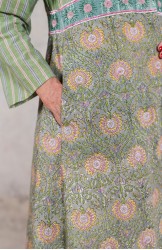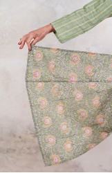 Si tratta di una stampa realizzata con blocchi di legno, intagliati, che vengono immersi nel colore e poi appoggiati sul tessuto per creare il disegno.