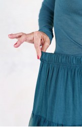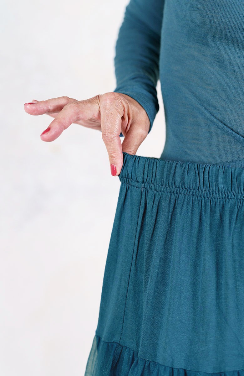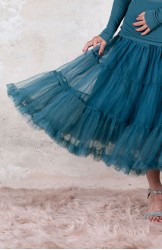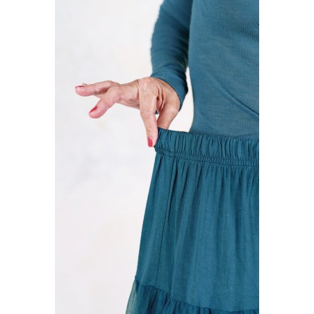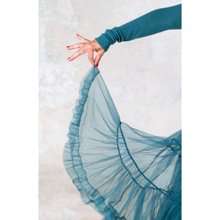 Divina sottogonna in jersey di viscosa e tulle, tinta nei cinque colori Essential Raptus&Rose. La Divina è sia sottogonna che gonna: perfetta sotto il Perfecto e qualsiasi gonna o abito tu voglia animare di mondi altri, è pensata per essere però indossata anche da sola, o sopra i jeans, con la Vita Sweater o un cardigan caldo di mohair. Ha un elastico gentile in vita, tre balze orgogliose di tulle e una pudica porzione di jersey coprente, lunga fino a metà coscia.