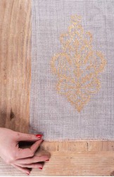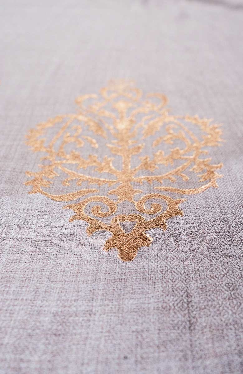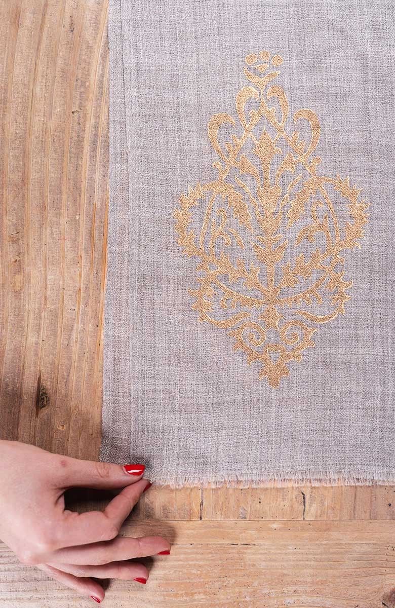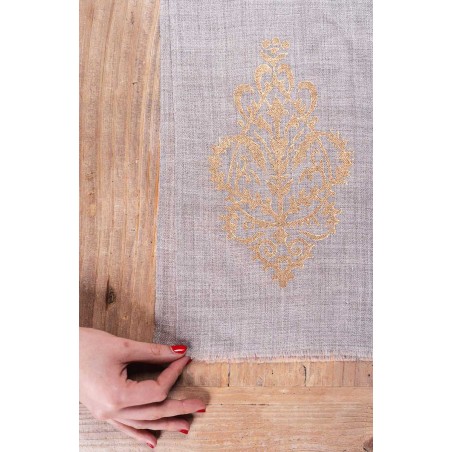 Stola di pashmina in lana melange molto sottile. Essenziale. Calda, leggera, morbida, avvolgente. Preziosa. Stampata oro con la tecnica manuale del block printing. Oro dall’aspetto antico, ricettato con grammi di polvere e pigmento. Oro che si somma al tessuto e diventa tattile. La cimosa lungo i lati più lunghi, la sfrangiatura fatta a mano sui lati più corti, la totale assenza di cuciture moltiplicano la sua leggerezza. Misure: circa 102x204 cm. Color sabbia caldo, il colore naturale della pashmina.