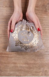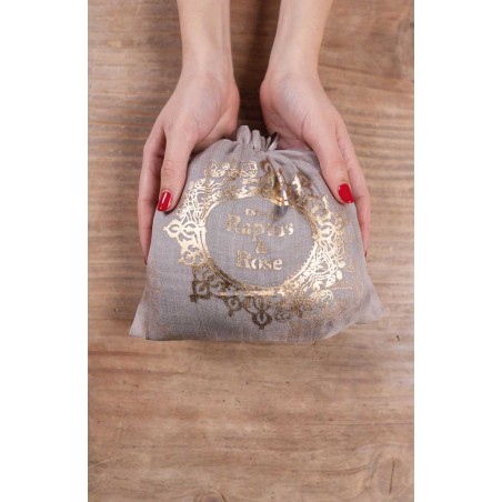 La pashmina viene spedita dentro il sacchettino di organza tinto nella sua stessa nuance e stampato a block print con il logo R&R.
