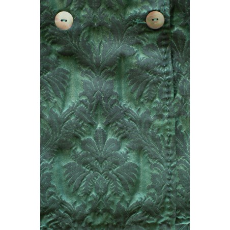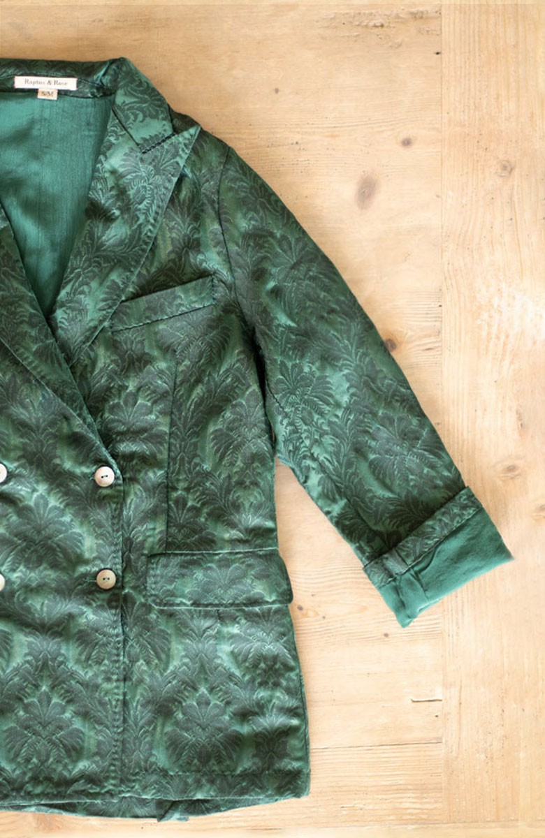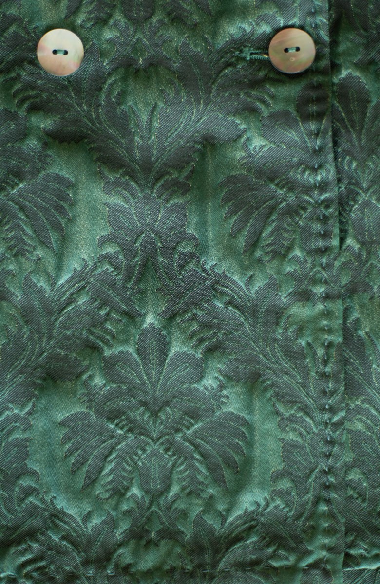 Giacca doppiopetto in broccato. Attorno a lei i desideri si fanno sussurri di eccentricità. Lei è la giacca che almeno una volta nella vita ogni donna ha desiderato indossare! La sua ispirazione nasce dalla giacca da uomo degli Anni ’30. Svuotata e ricostruita ne mantiene l’allure di eleganza ma si arricchisce di un nuovo significato di femminilità nomade. All’interno è cucita una fodera morbida e tinta nella stessa nuance rosa del tessuto. I bottoni piatti a 2 fori sono di madreperla, presenti anche sul fondo manica: sono 3 e sono apribili. Ha 2 spacchi sul fondo dietro, dettaglio che arriva dalla tradizione inglese. Il collo è a lancia e i suoi lembi sono uniti con il punto mosca: un dettaglio sartoriale e completamente manuale, quasi invisibile, ma fondamentale per tenere ferma la linea del collo. Le impunture lungo i perimetri sono in evidenza e sono fatte a mano. La pattina delle tasche può essere inserita dentro la tasca stessa e così la tasca diventa a filo. La posizione della cucitura della spalla è un punto fondamentale della Travel Jacket. Non è sulla spalla ma dietro, è il dettaglio che permette di vestire la spalla, avvolgendola e non semplicemente coprendola. La giacca pretesa da tutte le edizioni del Festival di San Remo da qui a per sempre!