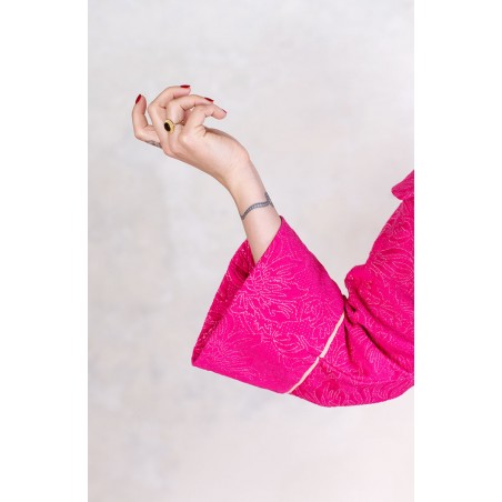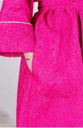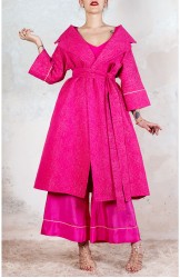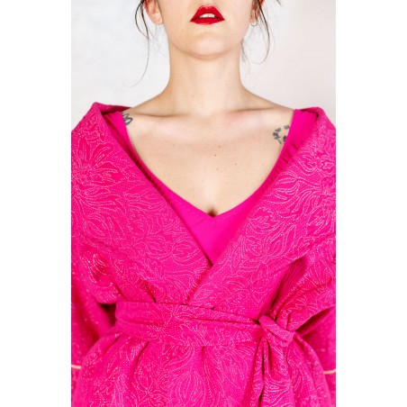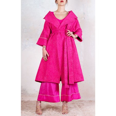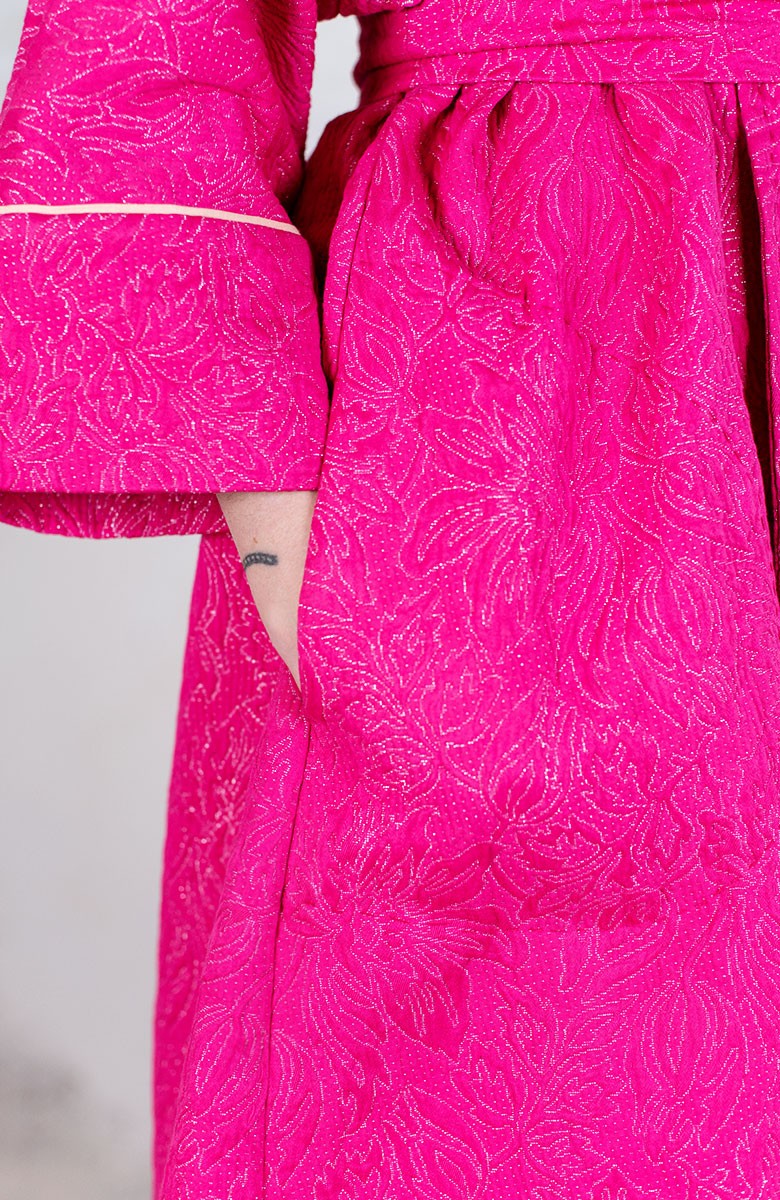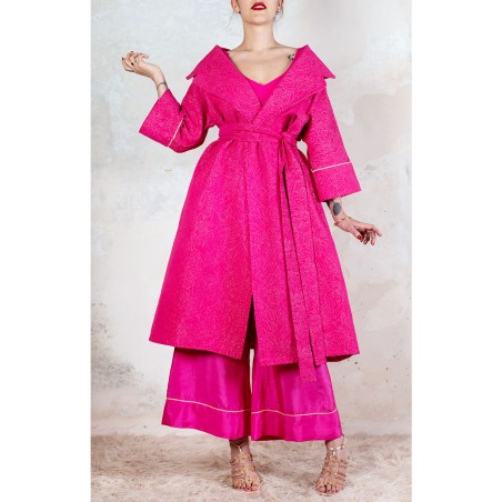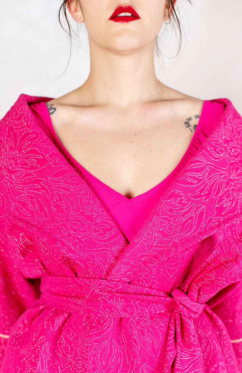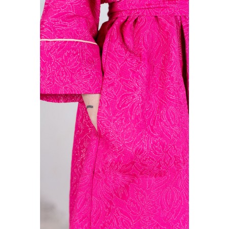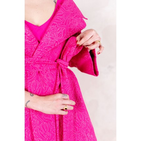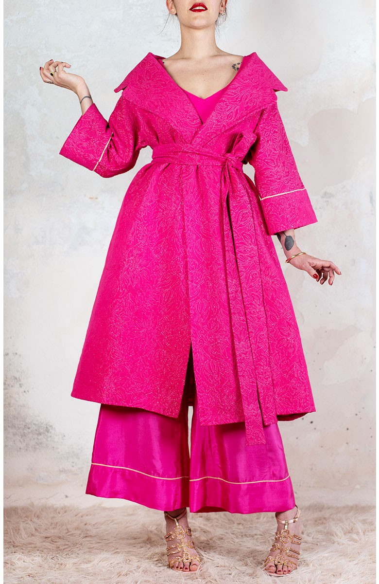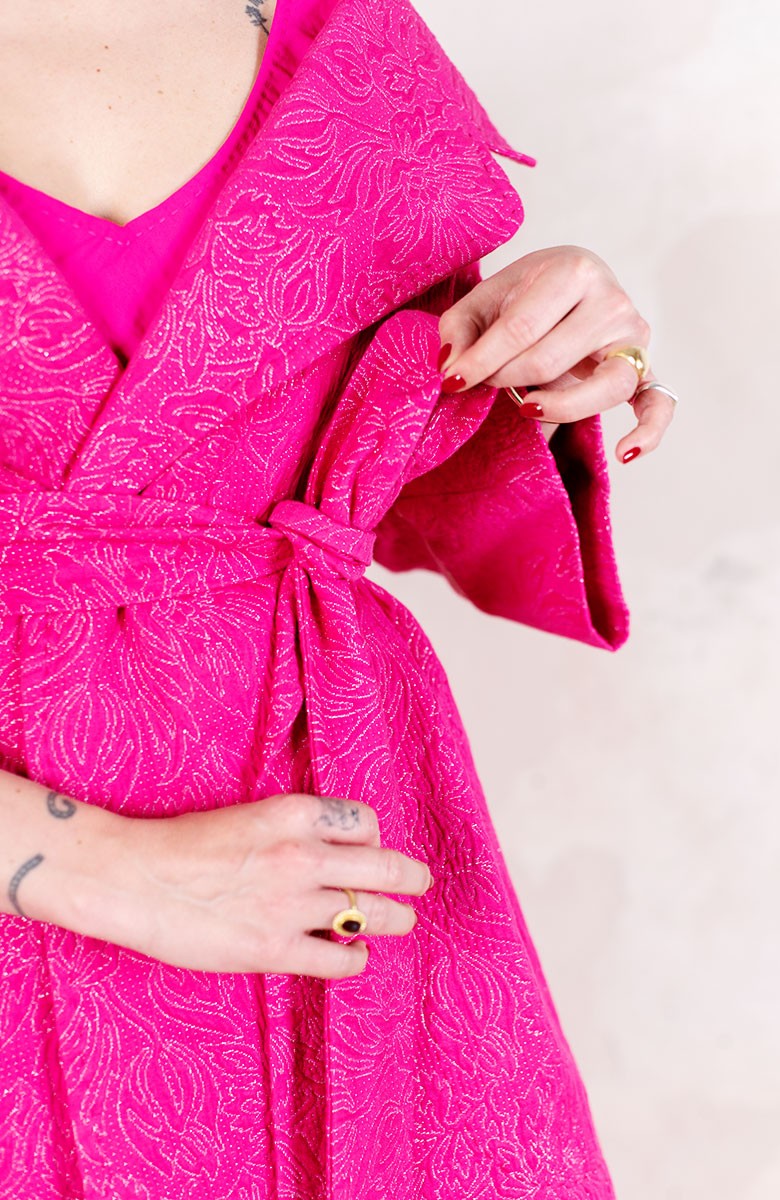 Cappottino ispirato alle linee anni Cinquanta, con collo ampio, perfetto sia come coat primaverile, sopra un Perfecto Dress o i jeans, sia come abito robe-manteau. Cotone matelassé e filo di lurex, colore Indian Pink. Manica raglan, lunghezza a tre quarti. Cintura in vita. Tasche profonde sul fianco. Punti a mano a vista. Taglia unica, veste dalla 38 alla 48.