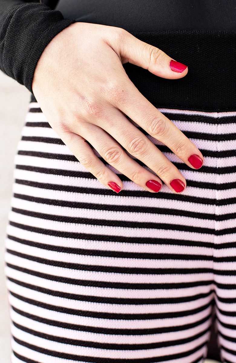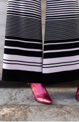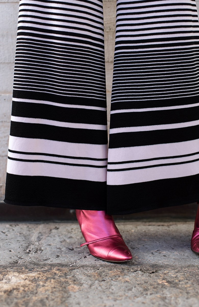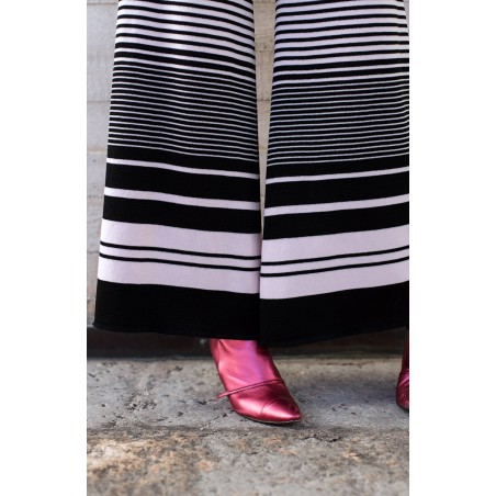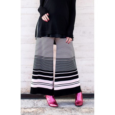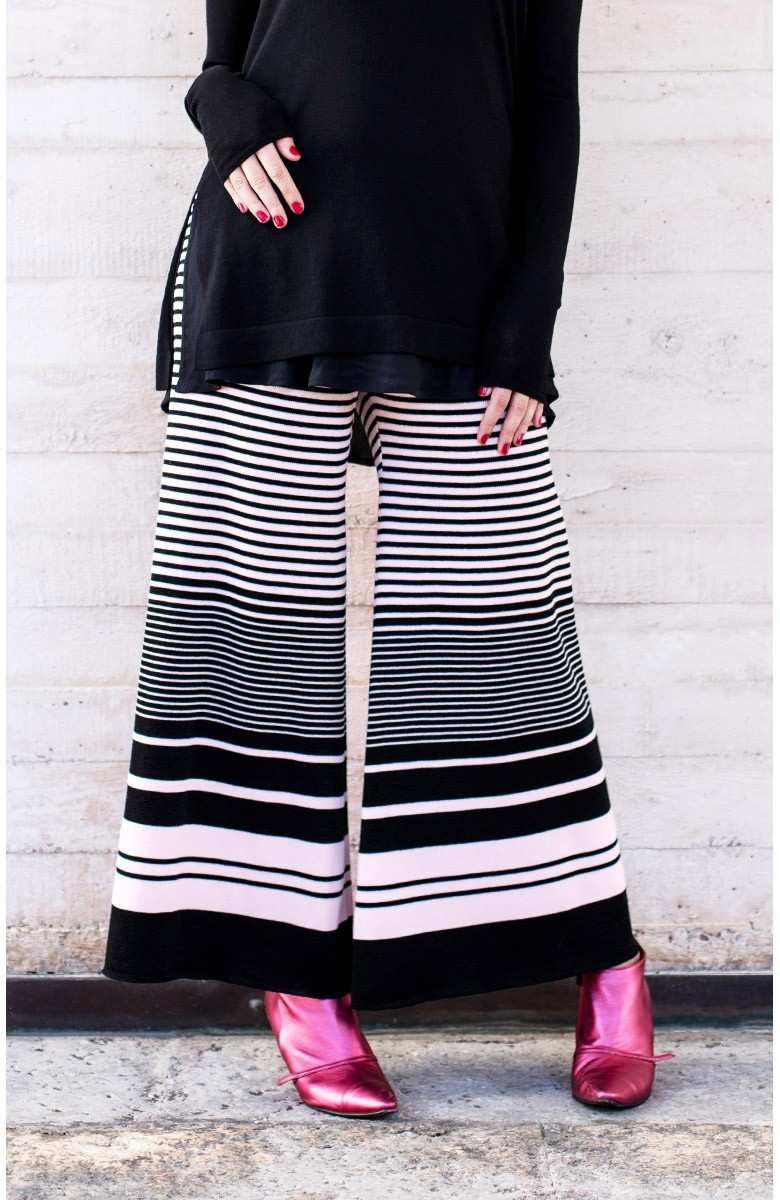Pantaloni ampi di maglieria a righe. Il filato è un’alternanza, come le righe, di lana merino e cotone caldo con un filo di lurex. Il lurex regala bagliori quasi impercettibili, la lana merino e il warm cotton morbidezze e tepori infiniti. La forma è la Raptus Iconic Shape ultracomoda, ultrafemminile con il suo elastico morbido e il fianco unito. Lo sapevi che gli Iconic Pant tolgono d’emblée una taglia? Non è un miracolo, ma un attento studio dei volumi e del posizionamento delle cuciture. Abbiamo proposto negli anni Edizioni Limitate di Iconic Pant a fiori giganti, con disegni ricavati da una cravatta vintage o da un foulard dell’Archivio Segreto e plain colour, ma ciò che ancora mancava agli Iconic Pant erano le righe. Amatissime, indossatissime, iconicissime righe! Finalmente ora esistono.