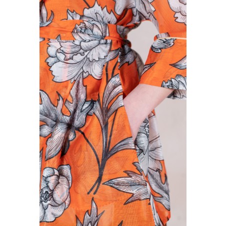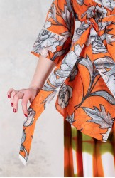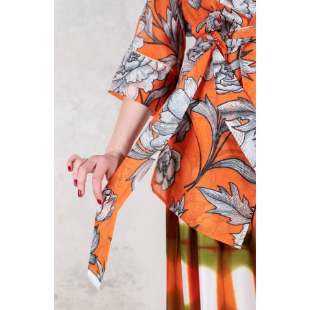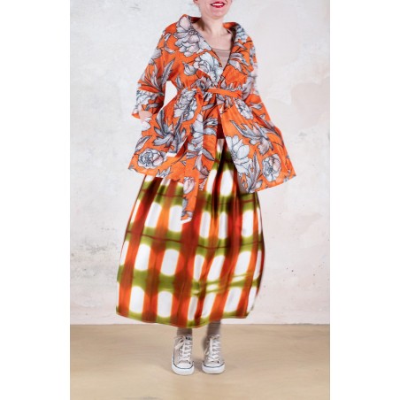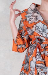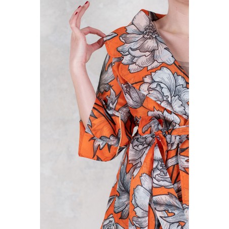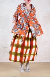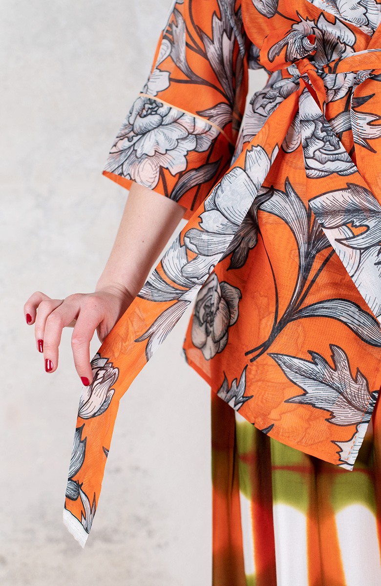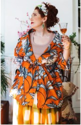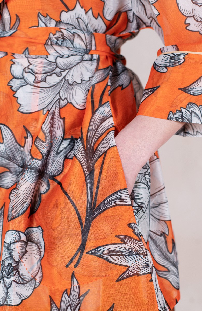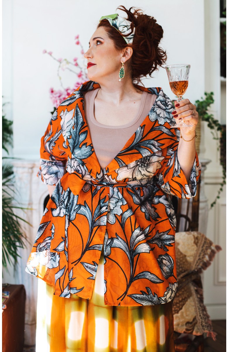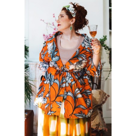 Ispirata ai capispalla anni Cinquanta, la Queen Jacket Travel Edition è la versione iper femminile di un capo solitamente vissuto come il maschile per eccellenza. Il suo tessuto stampato è leggero e morbido. Il cartamodello è stato studiato nel dettaglio, per arrivare a una forma che illumina e valorizza spalle, vita e décolleté con il suo collo ampio, la sua manica a raglan a tre quarti, la sua cintura nello stesso tessuto da stringere e portare sotto il seno. Le tasche profonde sui fianchi, le impunture a vista fatte a mano, le cuciture all’inglese, i sottopunti a mano, il piping sul fondomanica sono il suo manifesto sartoriale.