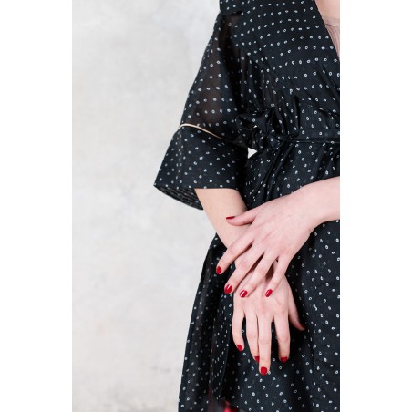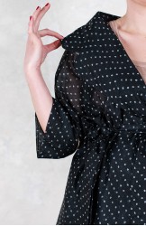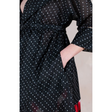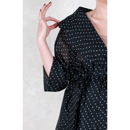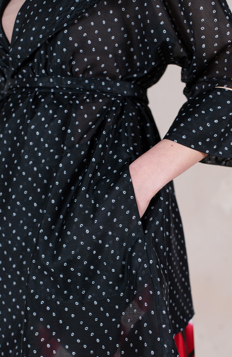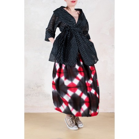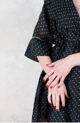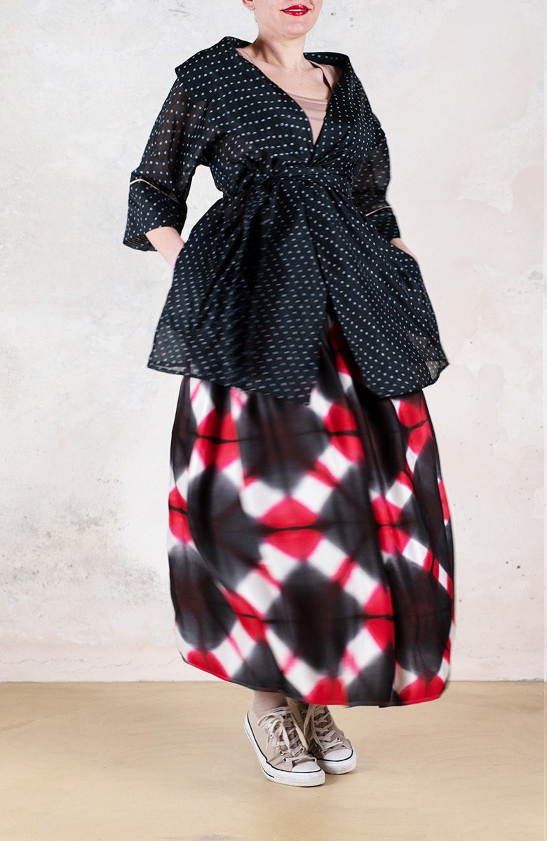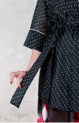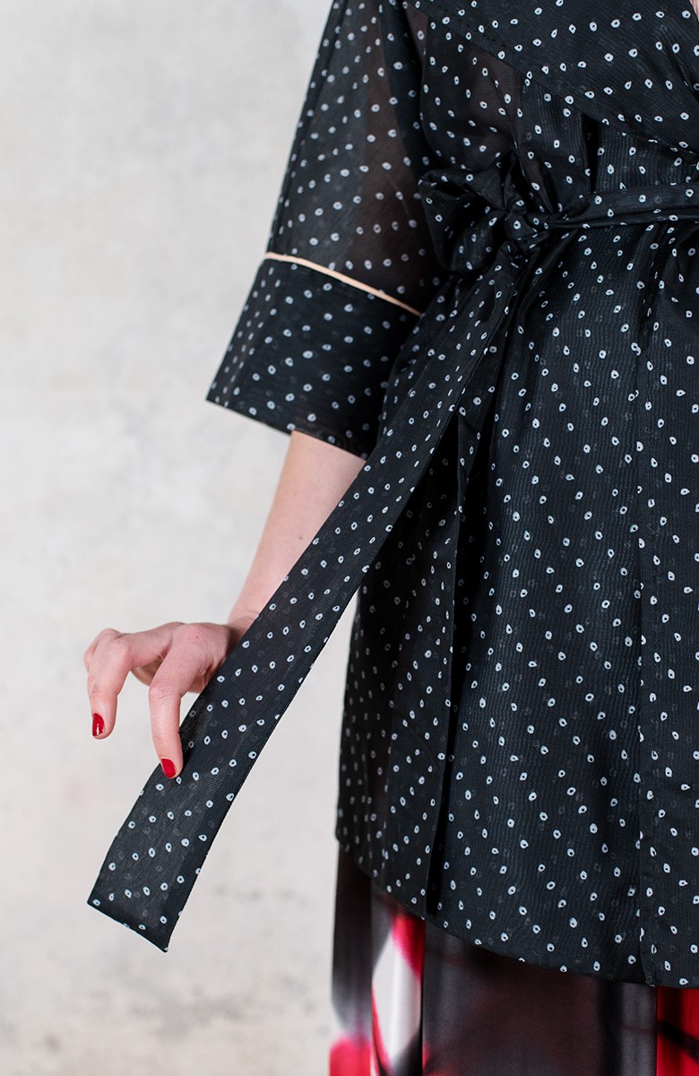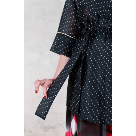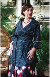 Ispirata ai capispalla anni Cinquanta, la Queen Jacket Travel Edition è la versione iper femminile di un capo solitamente vissuto come il maschile per eccellenza. Il suo tessuto stampato è leggero e morbido. Il cartamodello è stato studiato nel dettaglio, per arrivare a una forma che illumina e valorizza spalle, vita e décolleté con il suo collo ampio, la sua manica a raglan a tre quarti, la sua cintura nello stesso tessuto da stringere e portare sotto il seno. Le tasche profonde sui fianchi, le impunture a vista fatte a mano, le cuciture all’inglese, i sottopunti a mano, il piping sul fondomanica sono il suo manifesto sartoriale.
