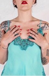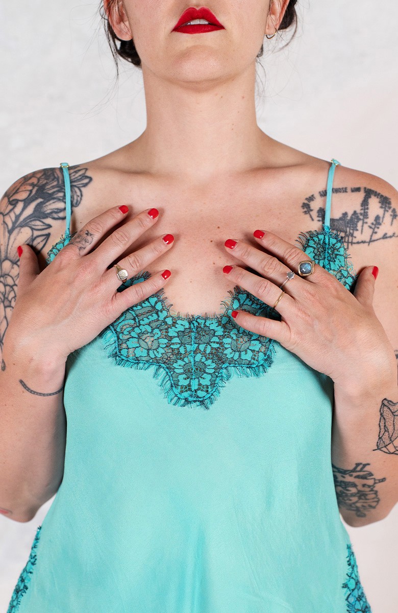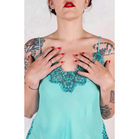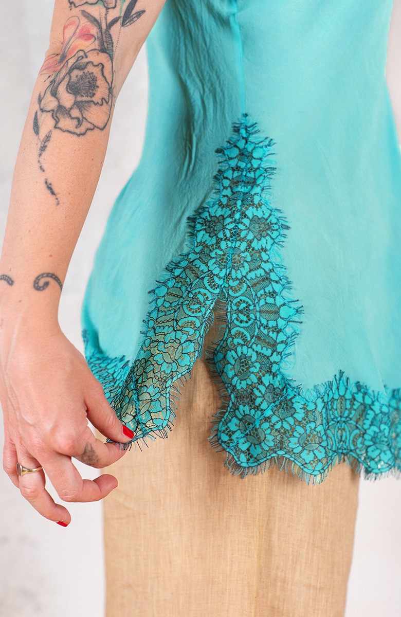Si chiama sottoveste, eppure la indossi come una t-shirt. È sartoriale, eppure la indossi come una t-shirt. Della sottoveste ha le spalline sottili e regolabili, il pizzo posizionato in impeccabile simmetria lungo lo scollo, il fondo e gli spacchi laterali. Prezioso e completamente incrostato. L’incrosto è una lenta tecnica sartoriale grazie alla quale di 2 tessuti ne viene realizzato un terzo: il pizzo non viene banalmente applicato, ma è come se fosse innestato nel tessuto. Tra il pizzo e il tessuto esiste solo lo spessore minimale della cucitura. È tagliata in sbieco per poter scivolare sulle forme, senza segnarle, è rifinita con i punti a mano. Della t-shirt ha la versatilità, la comodità, la facilità. Lei sarà la tua complice prediletta per essere tutte le mille te che sono in te. La riceverai dentro il sacchettino di organza nel suo stesso colore.