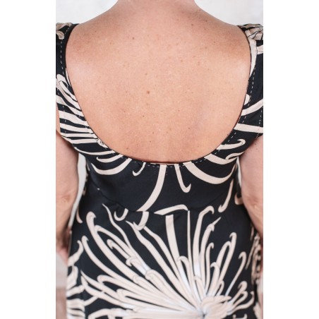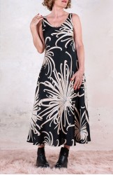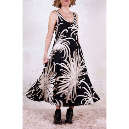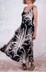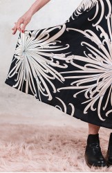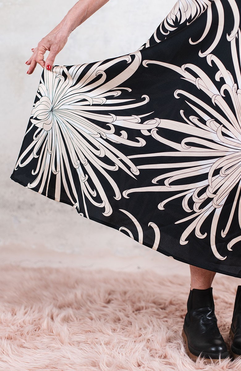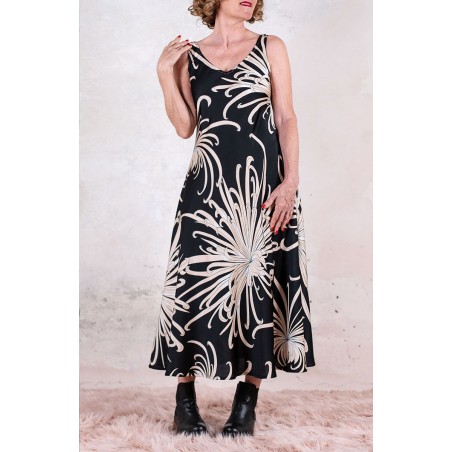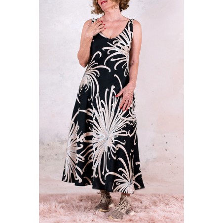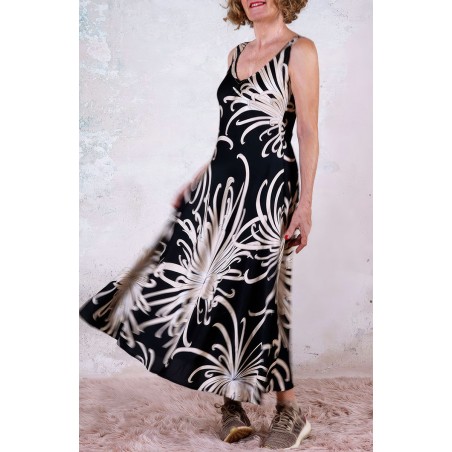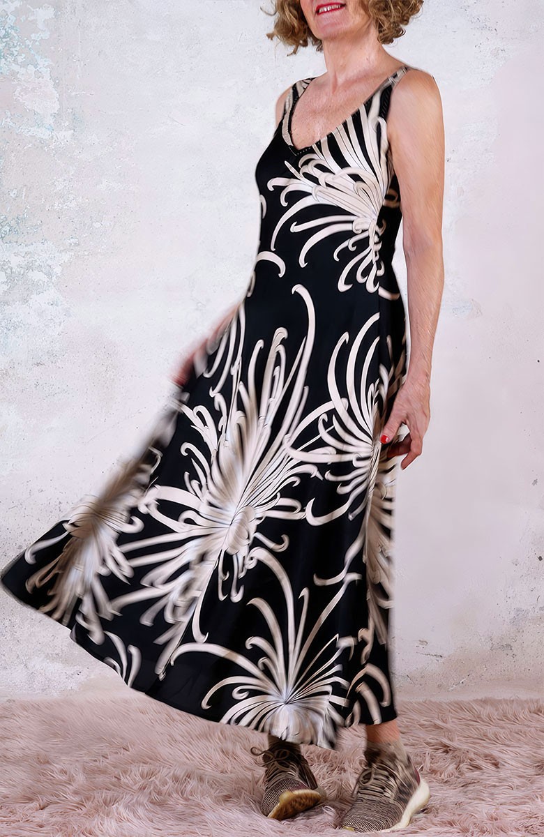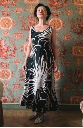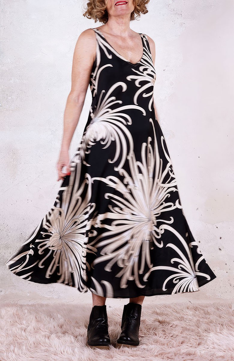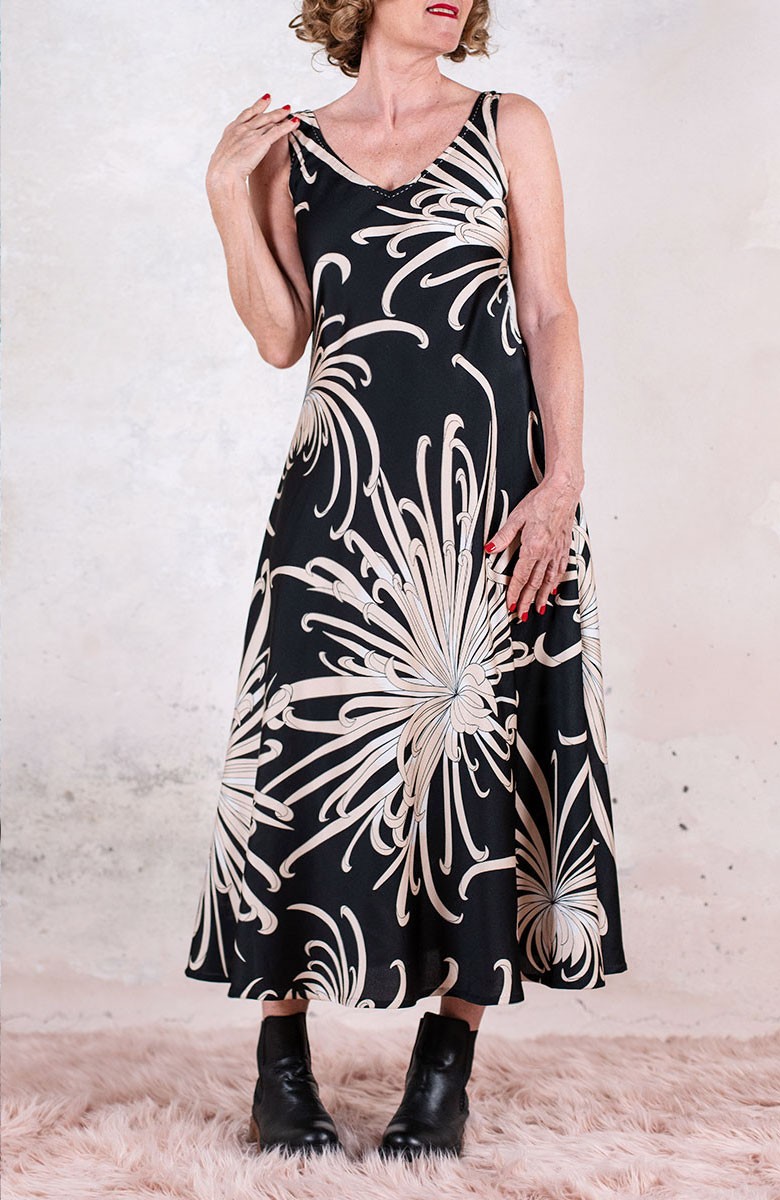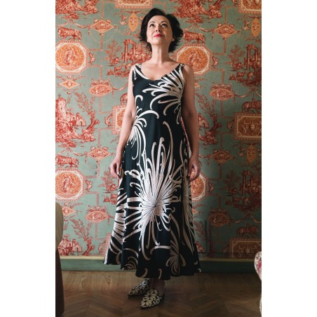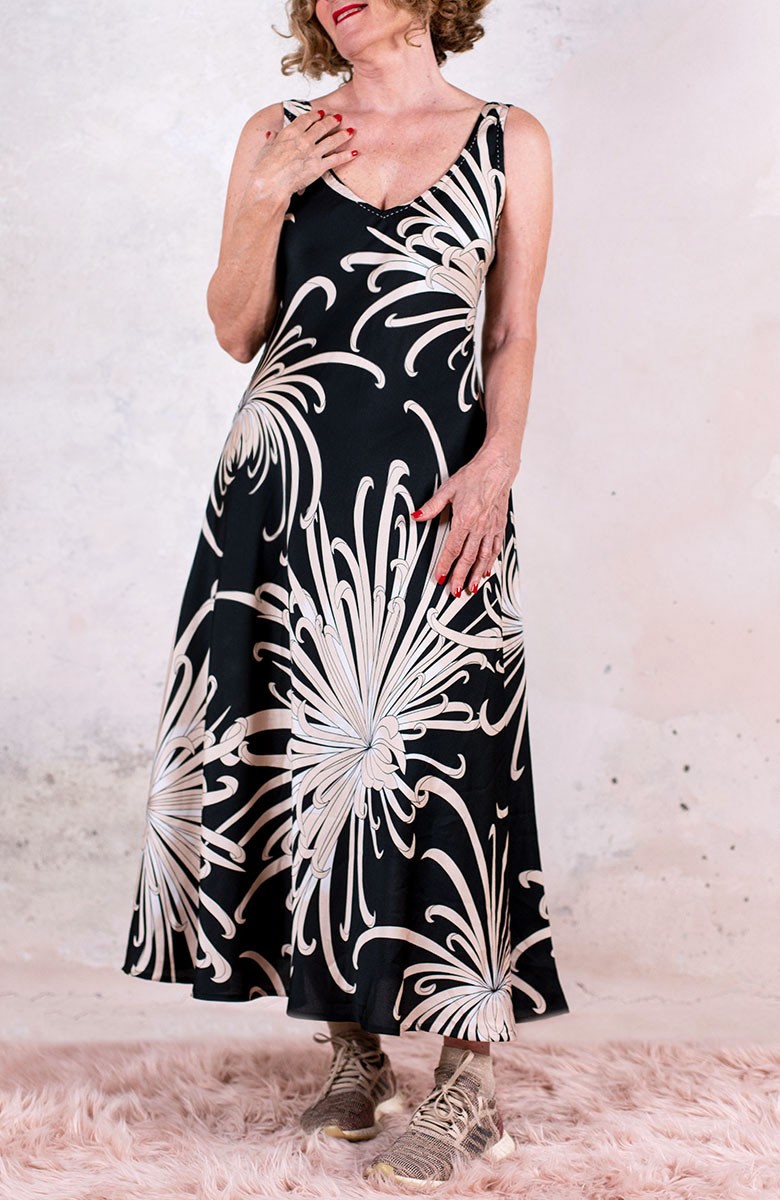 Vestito senza maniche con scollo profondo, sapiente e ultrafemminile. È tagliato in sbieco, con profili e fondo rifiniti con 4 metri di punti a mano. Scivola fluido e liquido sul corpo e lo asseconda nei movimenti e nelle forme, Tessuto di raso di poliestere con effetto martellato e stampa floreale, su fondo nero. La stampa arriva da un antico kimono trovato durante un viaggio di ricerca in Giappone. Il crisantemo è un fiore imperiale dal significato bellissimo e sta all’Oriente come la rosa sta all’Occidente. Si narra che di notte venga avvolto da tessuti di seta per poter raccogliere la sua rugiada, con cui le donne si rinfrescano la pelle al mattino per ottenere longevità, bellezza, felicità. È l'abito perfetto per viaggiare. Lo lavi la sera nel lavandino dell’albergo, lo metti ad asciugare nella doccia, e al mattino lo puoi indossare così com’è, perché è instropicciabile. Bye bye ferro da stiro e benvenuta valigia.