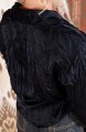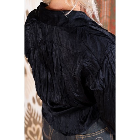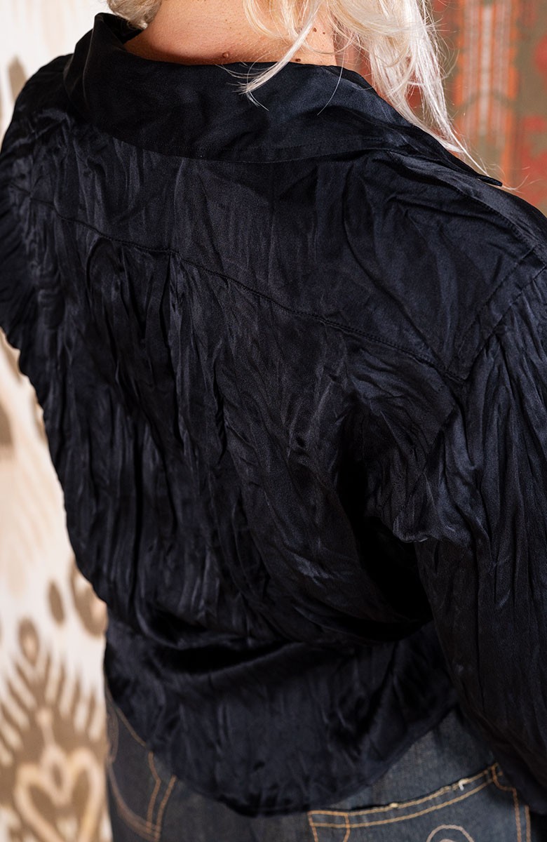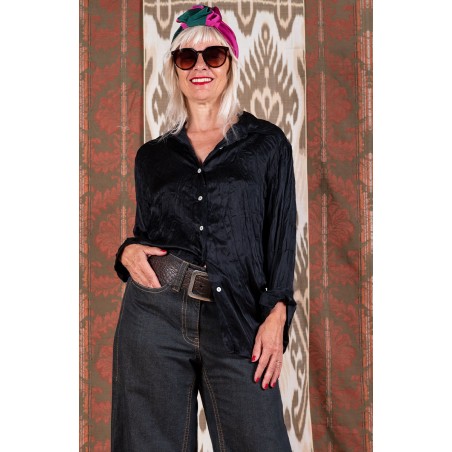 Camicia in raso di seta ispirata alla camicia da uomo di cui conserva alcuni dettagli, come il faldone sulla schiena, il carré doppiato, il colletto all’italiana, ma avvicinata al mondo femminile attraverso la ricostruzione dei volumi e delle proporzioni. La manica e i polsini sono stati riproporzionati; il colletto e i polsini sono stati svuotati dalla rigidità dell’adesivo interno. Il suo tessuto è morbido, fluido e con quella caduta che esalta la femminilità alla sua potenza più elevata. Bottoni di madreperla, cuciture sartoriali a incastro. Il colore ricorda il cioccolato bianco, perché è mescolato a quella punta di vaniglia, che lo scalda, lo addolcisce e lo rende très chic e contemporaneamente facile da mixare, persino con il bianco puro. Attorcigliata sé su stessa e arrotolata viene consegnata dentro un sacchettino di organza e può essere indossata stropicciata. Un diamante è per sempre e la Travel Camicia è per ovunque