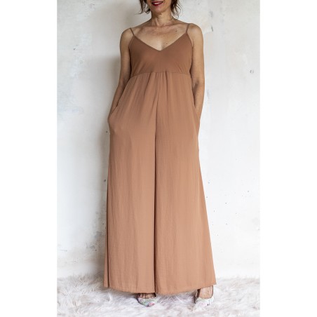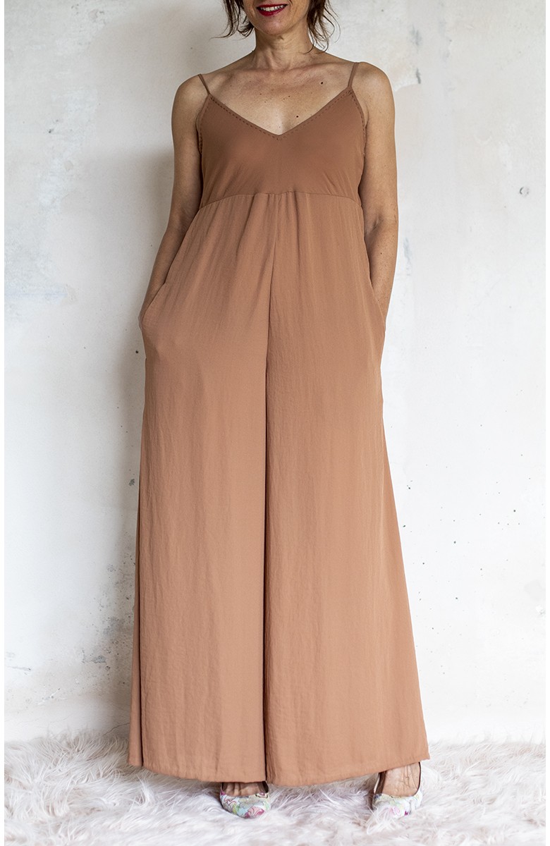Tuta di georgette molto leggera e fluida. La parte alta è in tagliata in sbiego e ha la tipica forma a sottoveste, con spalline regolabili. La parte sotto è un pantalone palazzo. Zip invisibile sul fianco. Tinta unita color biscotto. Un ibrido perfetto. Una creatura mezza Sottoveste e mezza Palace Pant. Sì perché la Tetuan è una tuta dallo scollo profondo e dalle sottili spalline e improvvisamente si trasforma e diventa fluida e comoda nei fluttuanti e ampi pantaloni, con due tasche profonde dove infilare le mani ed entrare in una totale comfort zone, celebrando la femminilità, sempre.