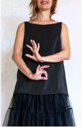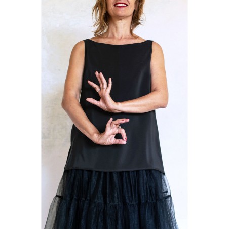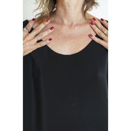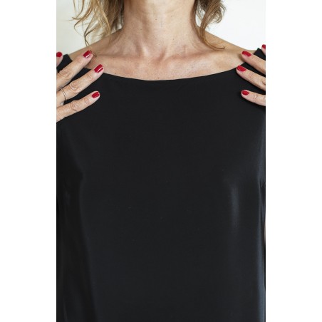 Rispetto al classico Top dallo scollo amato questo modello è più corto. Rimane però ampio, e nel movimento accompagna le forme del corpo.