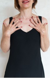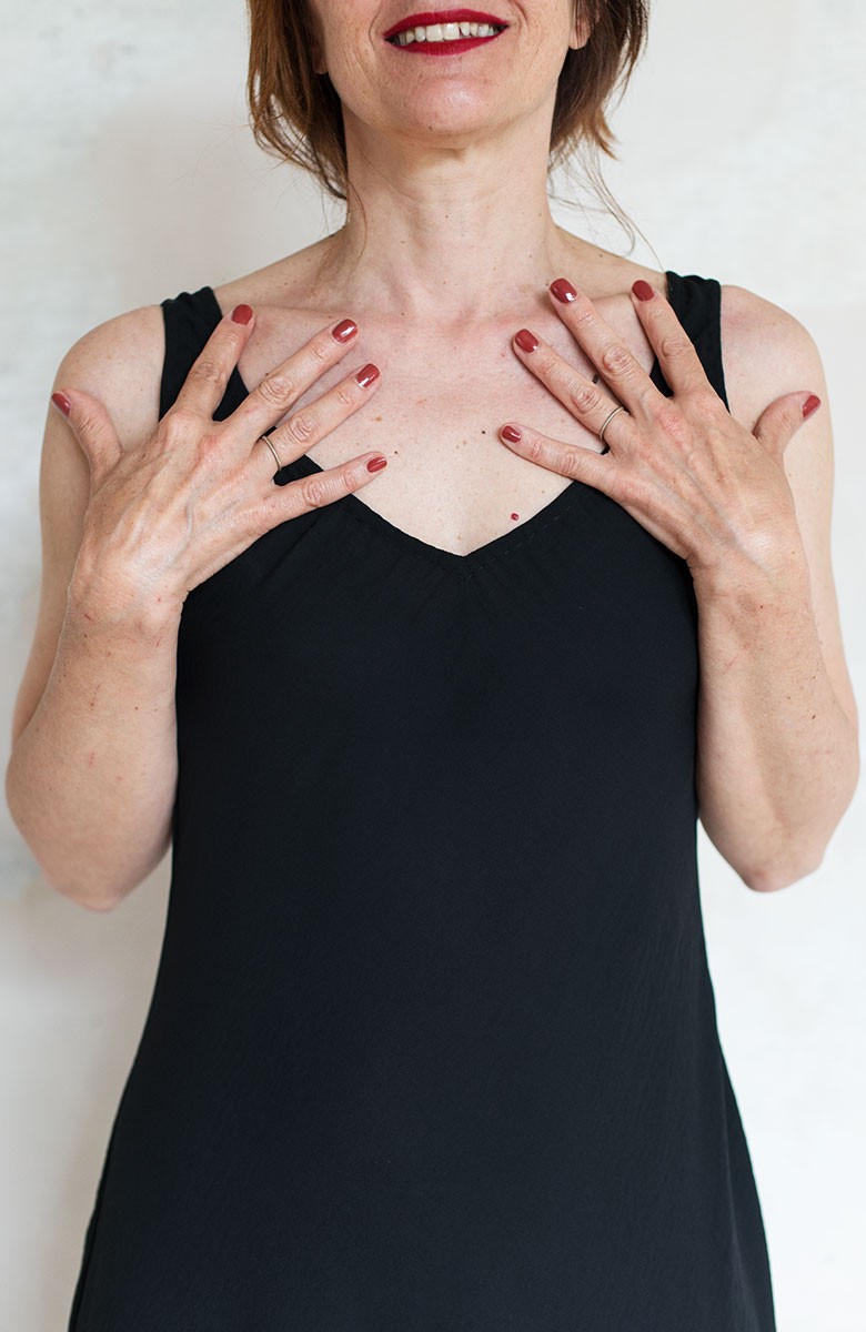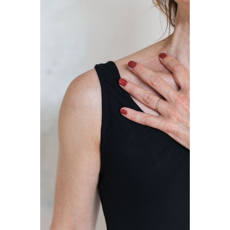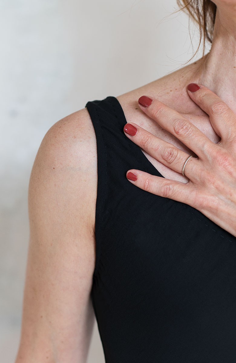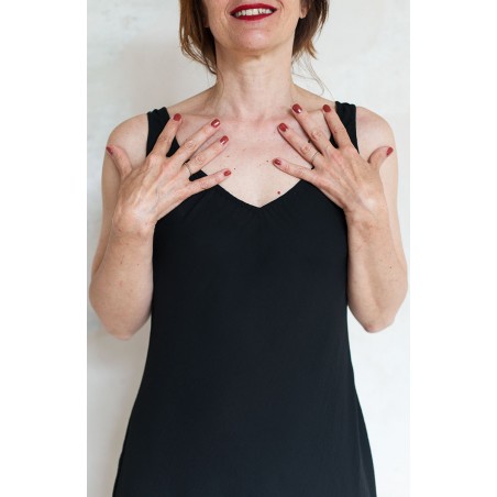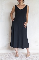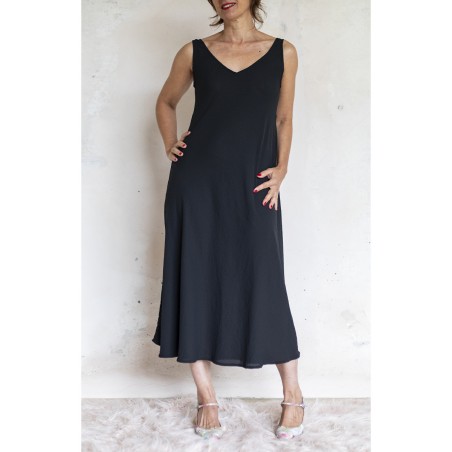 Vestito senza maniche con scollo profondo. E’ l'abito perfetto, scivola fluido e liquido sul corpo e lo asseconda nei movimenti e nelle forme, perché tagliato in sbieco e rifinito con infiniti punti a mano. La scollatura profonda e sapiente è ultra femminile. Pesa pochi grammi. Compagno inseparabile di viaggio, sempre.