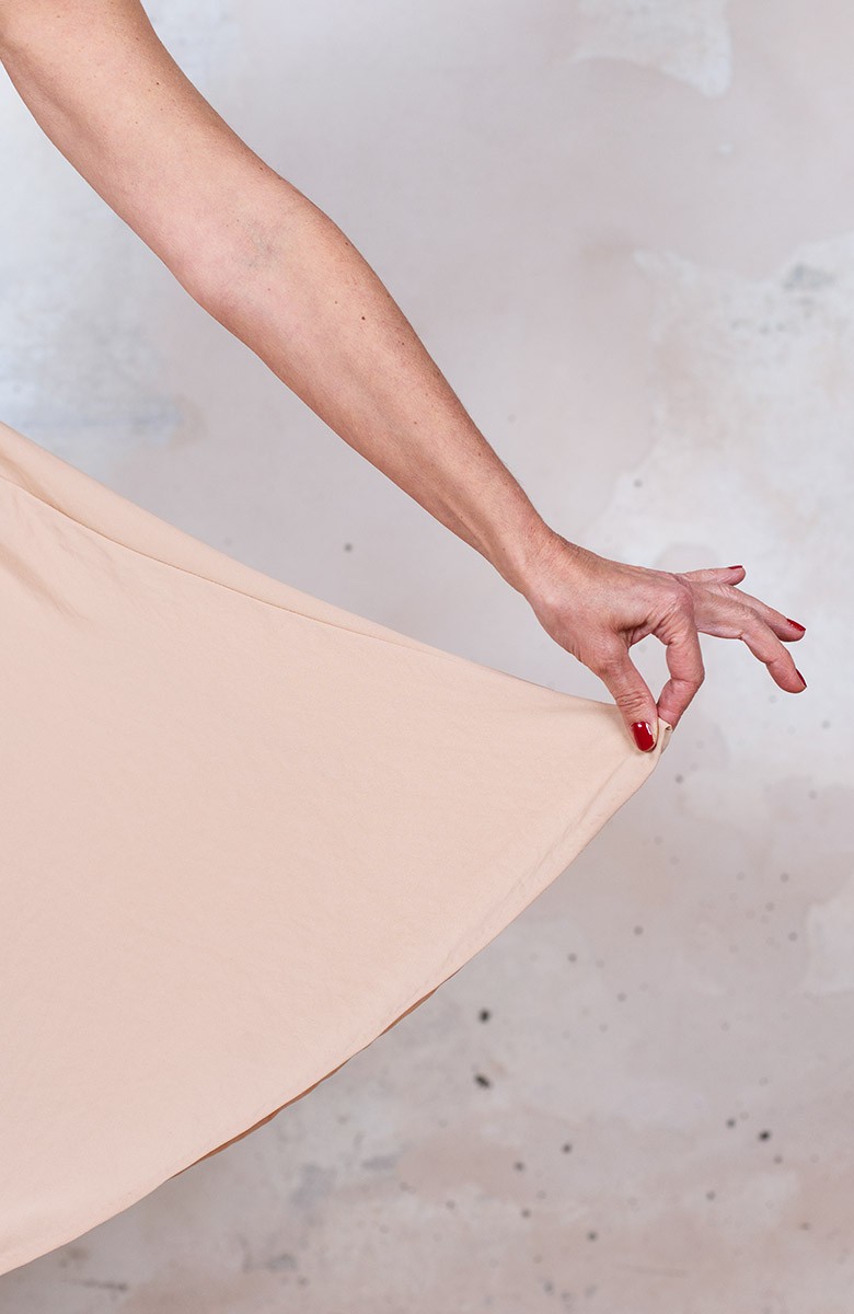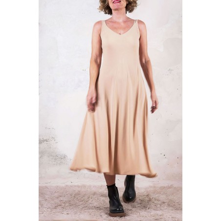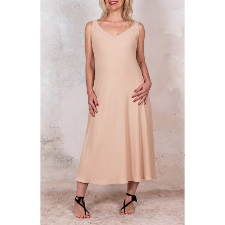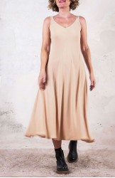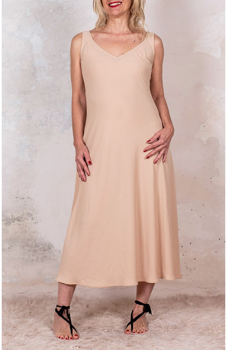Vestito senza maniche con scollo profondo. E’ l'abito perfetto, scivola fluido e liquido sul corpo e lo asseconda nei movimenti e nelle forme, perché tagliato in sbieco e rifinito con infiniti punti a mano. La scollatura profonda e sapiente è ultra femminile. Pesa pochi grammi. Compagno inseparabile di viaggio, sempre.