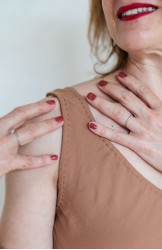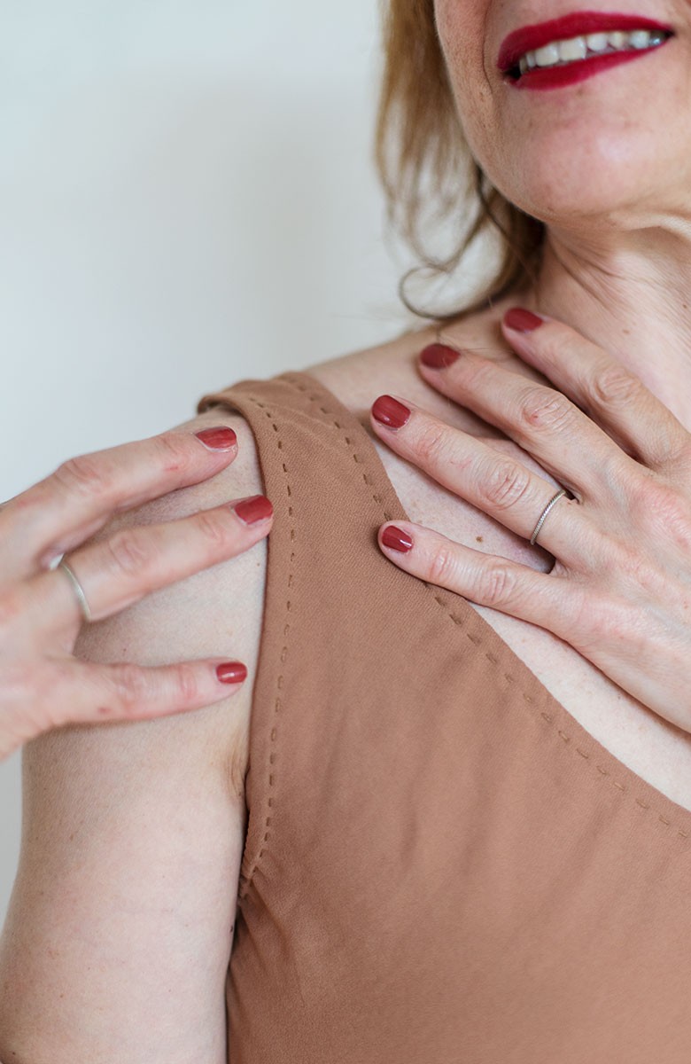 Vestito senza maniche con scollo profondo. E’ l'abito perfetto, scivola fluido e liquido sul corpo e lo asseconda nei movimenti e nelle forme, perché tagliato in sbieco e rifinito con infiniti punti a mano. La scollatura profonda e sapiente è ultra femminile. Pesa pochi grammi. Compagno inseparabile di viaggio, sempre.