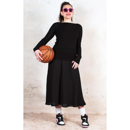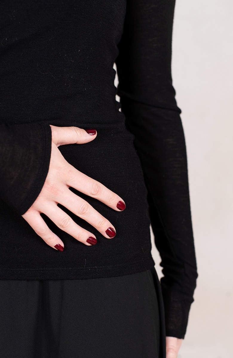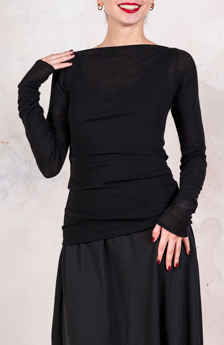 Maglia in jersey di pura e morbida lana merino che rispetta 6 tecnicità specifiche: è zero pilling, è una seconda pelle, è traspirante, è uno stratino perfetto, è termica, è elastica. Con il suo scollo Audrey, le sue maniche lunghissime, la sua consistenza quasi priva di spessore è l’oggetto ideale che risolve il problema di mettere le maniche al Perfecto: perfetta sia sotto che sopra. Ti verrà consegnata dentro il sacchettino di organza di seta tinto nel suo stesso colore. Ed è subito Valigia Perfecta.