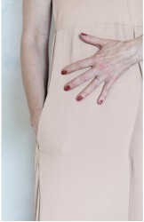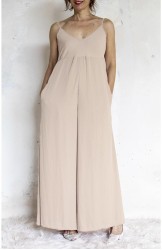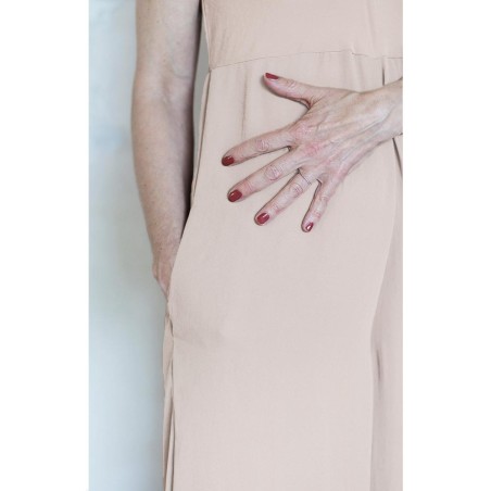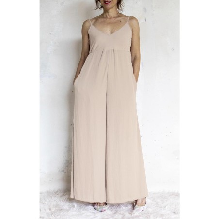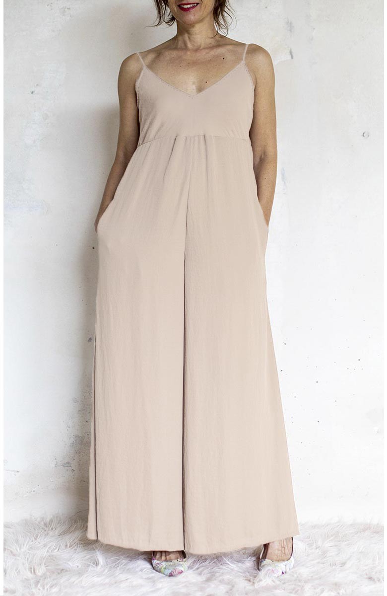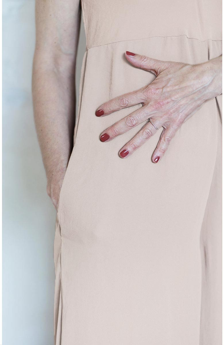 Tuta di georgette molto leggera e fluida. La parte alta è in tagliata in sbiego e ha la tipica forma a sottoveste, con spalline regolabili. La parte sotto è un pantalone palazzo. Zip invisibile sul fianco. Tinta unita color biscotto. Un ibrido perfetto. Una creatura mezza Sottoveste e mezza Palace Pant. Sì perché la Tetuan è una tuta dallo scollo profondo e dalle sottili spalline e improvvisamente si trasforma e diventa fluida e comoda nei fluttuanti e ampi pantaloni, con due tasche profonde dove infilare le mani ed entrare in una totale comfort zone, celebrando la femminilità, sempre.