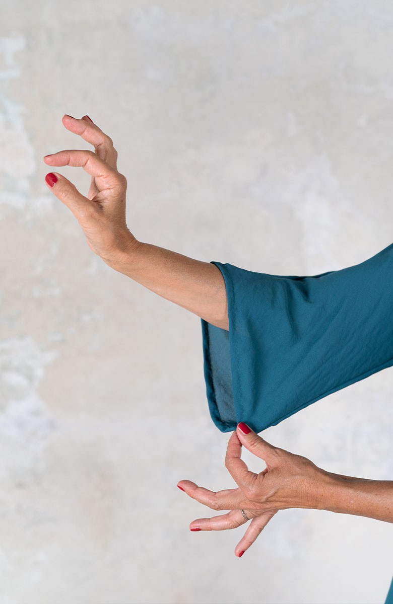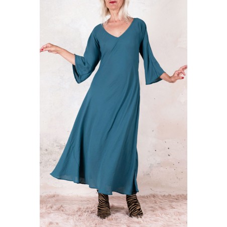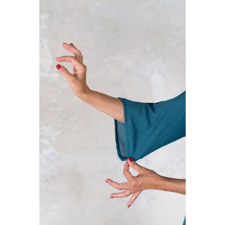 Vestito con scollo profondo e maniche a kimono. Tessuto tagliato in sbiego, profili rifiniti con punti a mano e inserto triangolare sul fondo davanti ispirato agli abiti sartoriali degli anni Venti. E’ l'abito perfetto, scivola fluido e liquido sul corpo e lo asseconda nei movimenti e nelle forme, perché tagliato in sbieco e rifinito con infiniti punti a mano. La scollatura profonda e sapiente è ultra femminile. Pesa pochi grammi, non si stropiccia. Lo lavi, lo asciughi al sole e lo metti dopo mezz’ora. Compagno inseparabile di viaggio. Irrinunciabile.