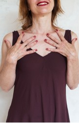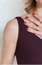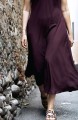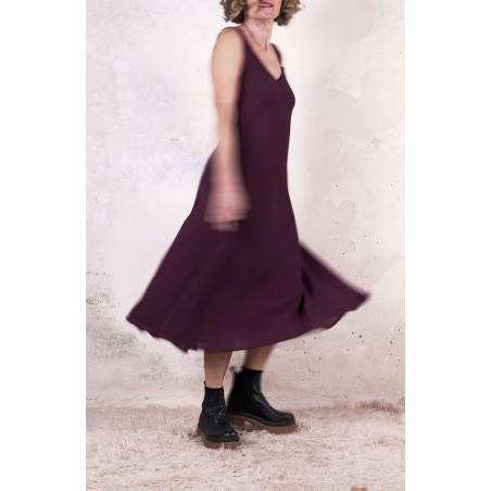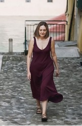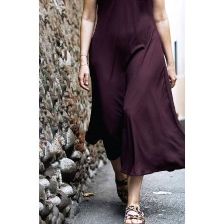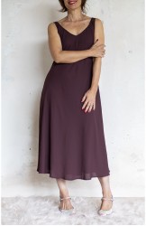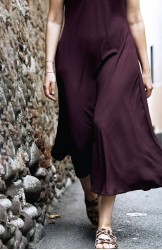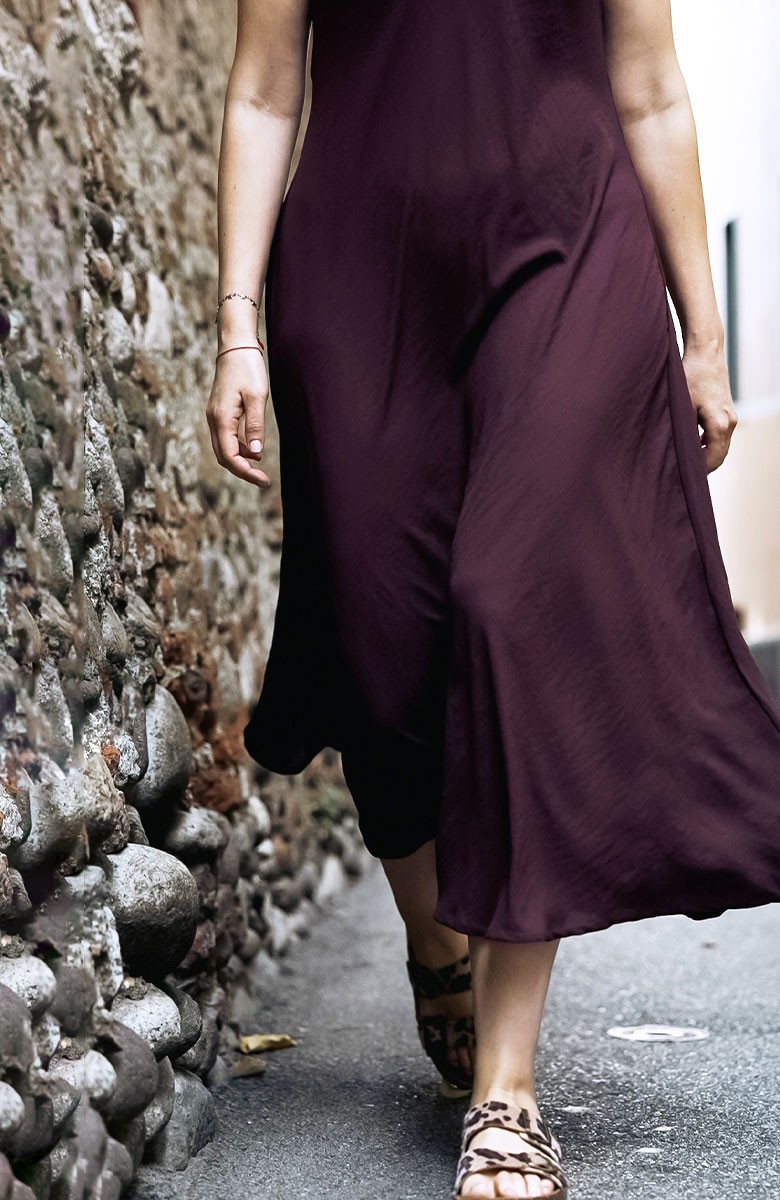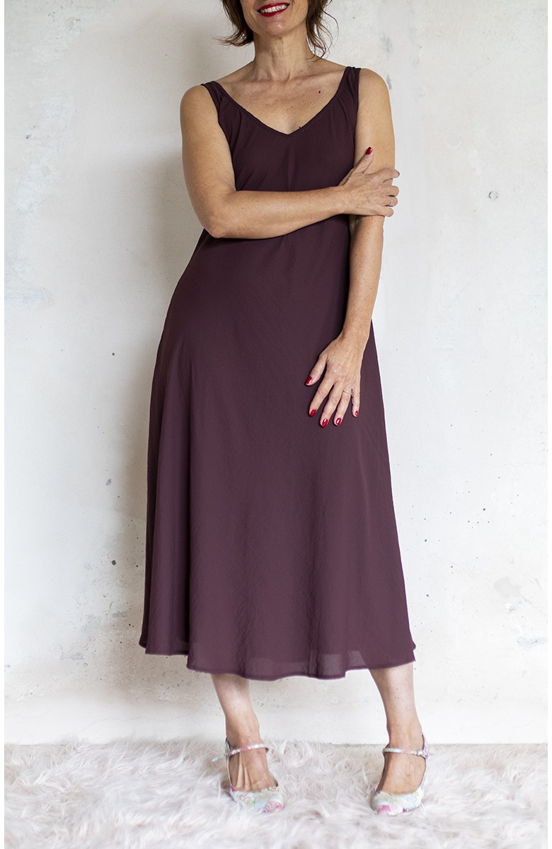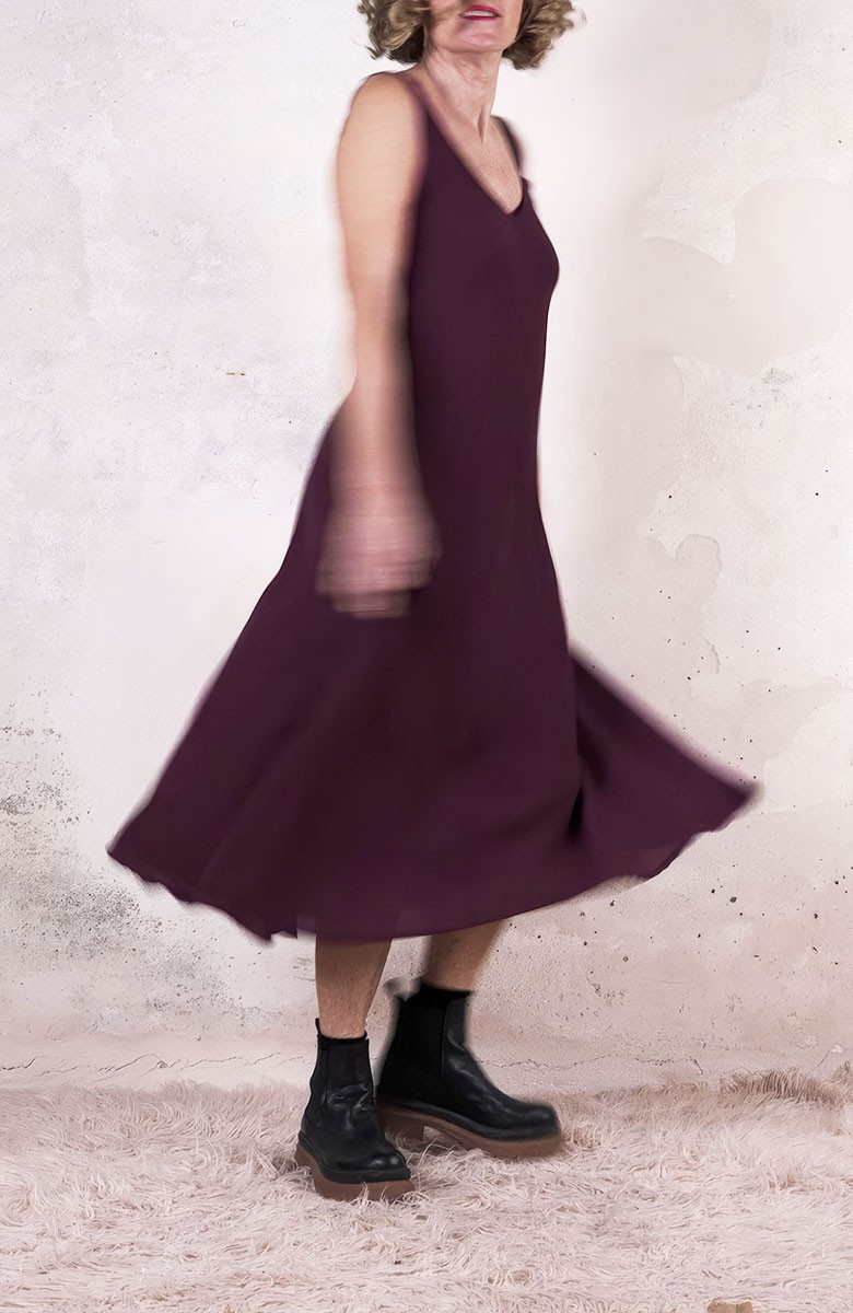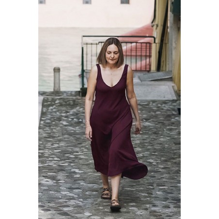 Vestito senza maniche con scollo profondo. E’ l'abito perfetto, scivola fluido e liquido sul corpo e lo asseconda nei movimenti e nelle forme, perché tagliato in sbieco e rifinito con infiniti punti a mano. La scollatura profonda e sapiente è ultra femminile. Pesa pochi grammi. Compagno inseparabile di viaggio, sempre.