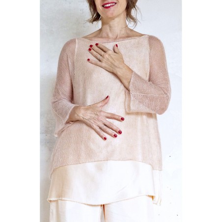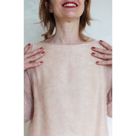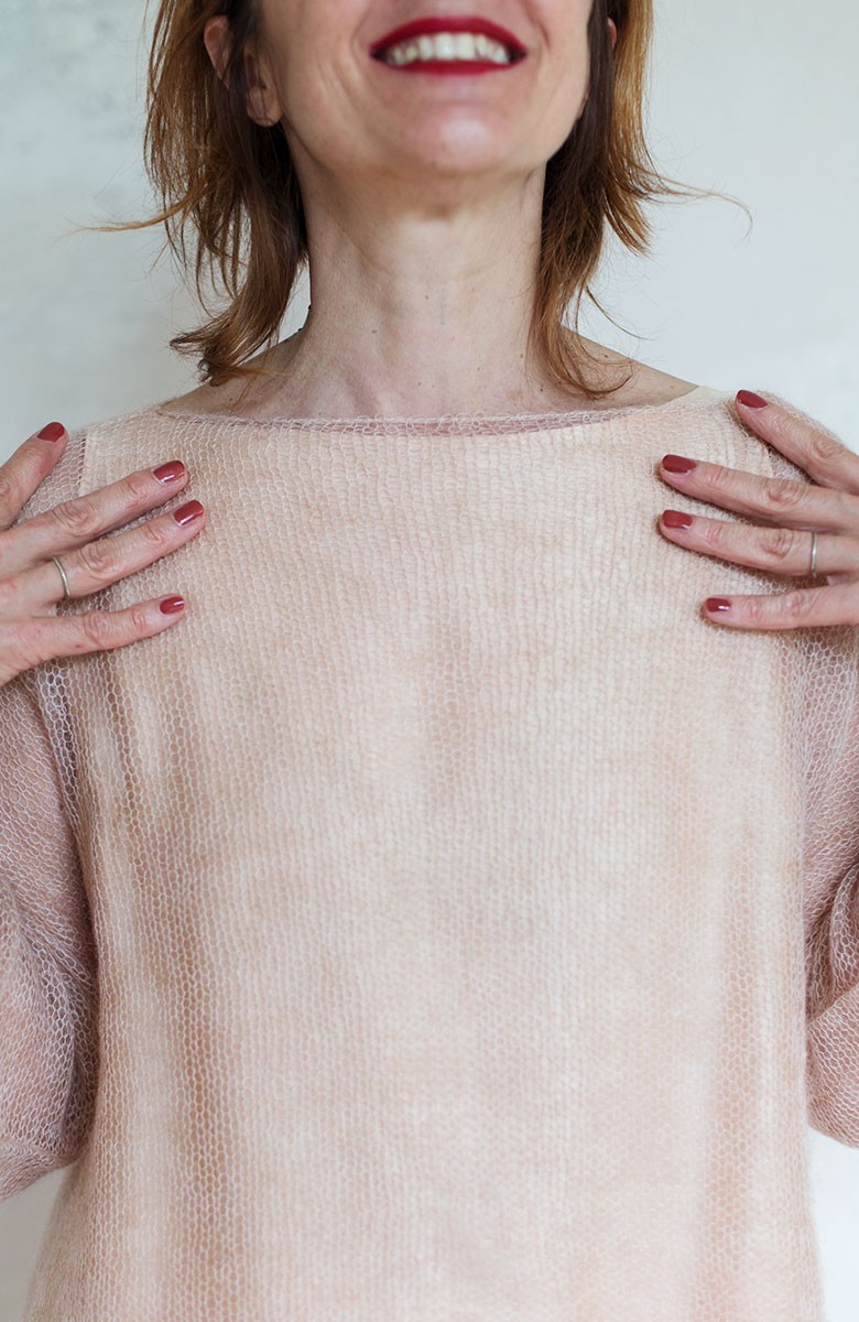Maglia con manica a kimono e scollo a barchetta, cuciture a rimaglio sul fianco -il rimaglio sta alla maglieria come i punti a mano stanno alla sartoria - .