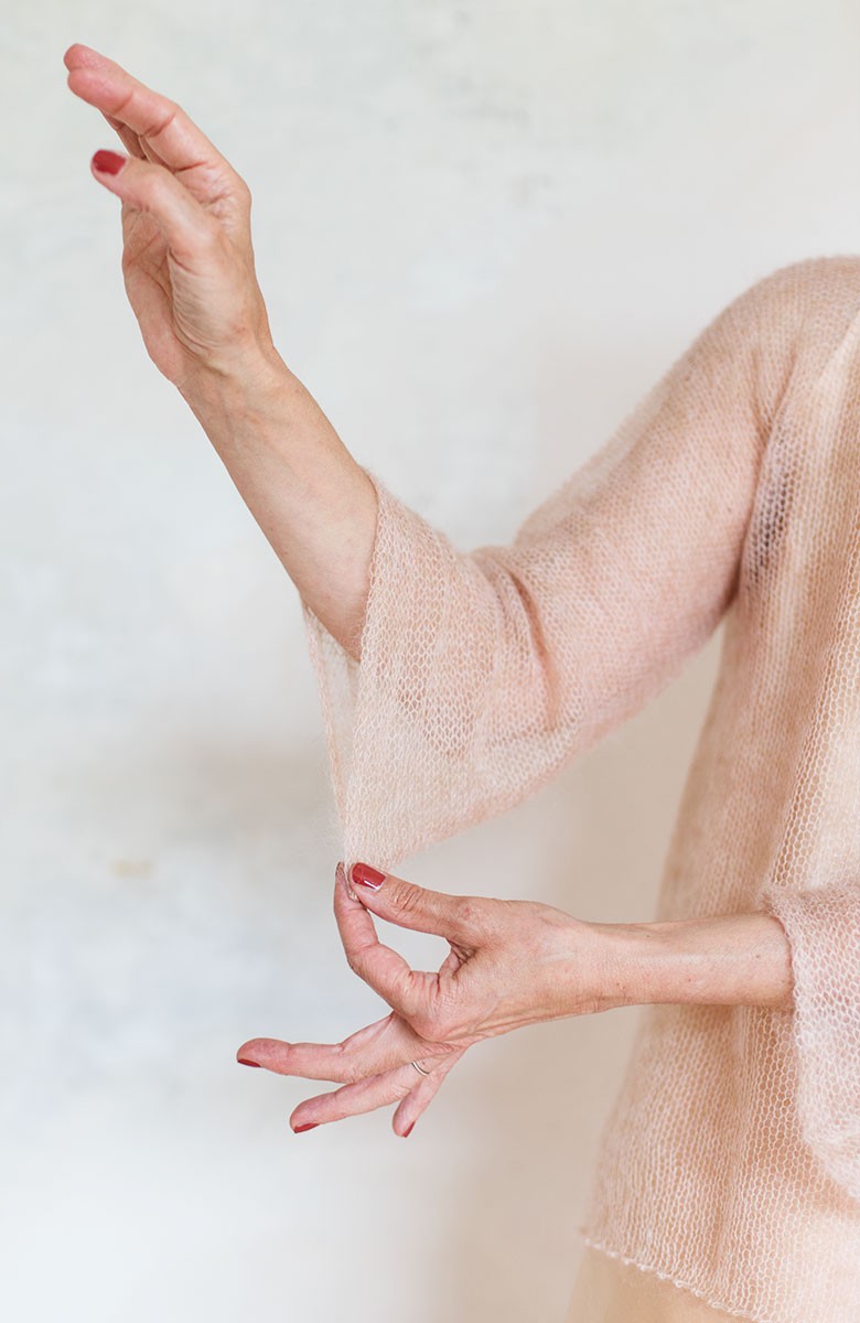 Il suo mohair è lavorato in rarefazione: il punto rasato aperto conferisce alla Poetical Sweater leggerezza e trasparenza.