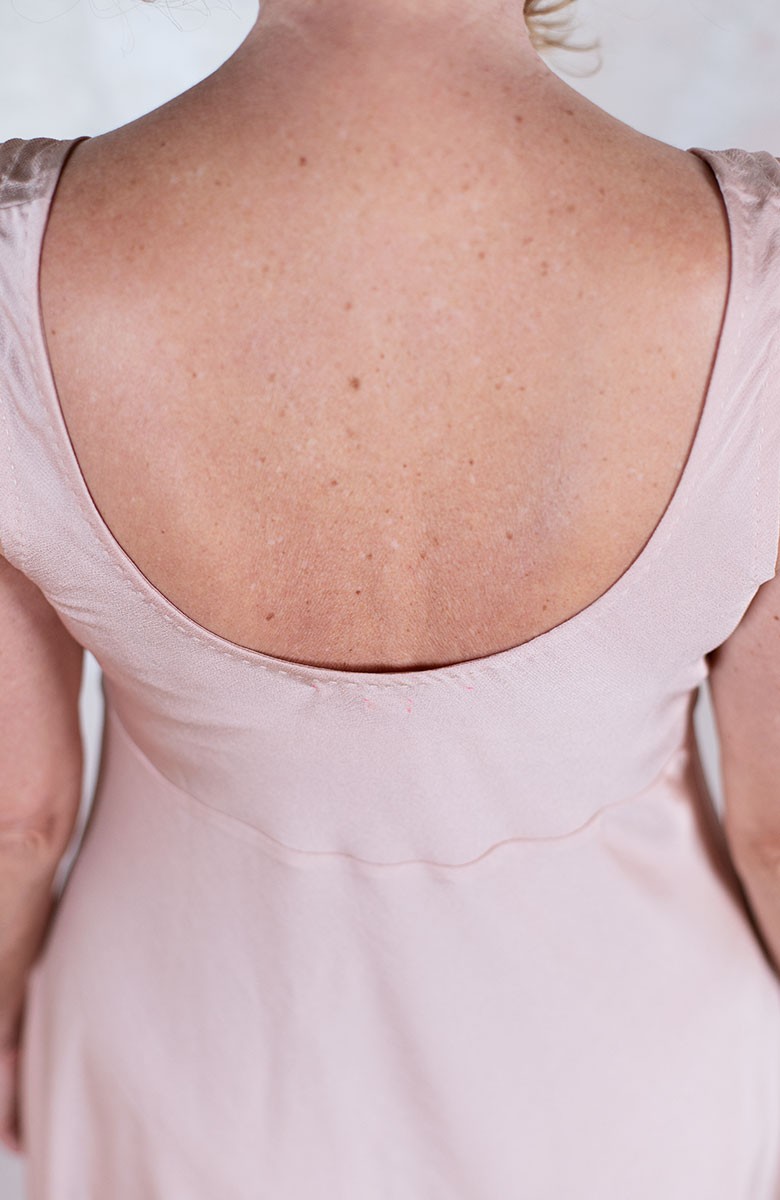 Vestito senza maniche con scollo profondo. Raso tagliato in sbiego, profili rifiniti con punti a mano e fondo tagliato al vivo. E’ l'abito perfetto, scivola fluido e liquido sul corpo e lo asseconda nei movimenti e nelle forme, perché tagliato in sbieco e rifinito con infiniti punti a mano. La scollatura profonda e sapiente è ultra femminile. Pesa pochi grammi. Compagno inseparabile di viaggio, sempre. La versione un po’ più pesante del Perfecto si chiama Nirvana, ed è liquida e lucida. Fluidamente irriverente. Giustamente stropicciata.