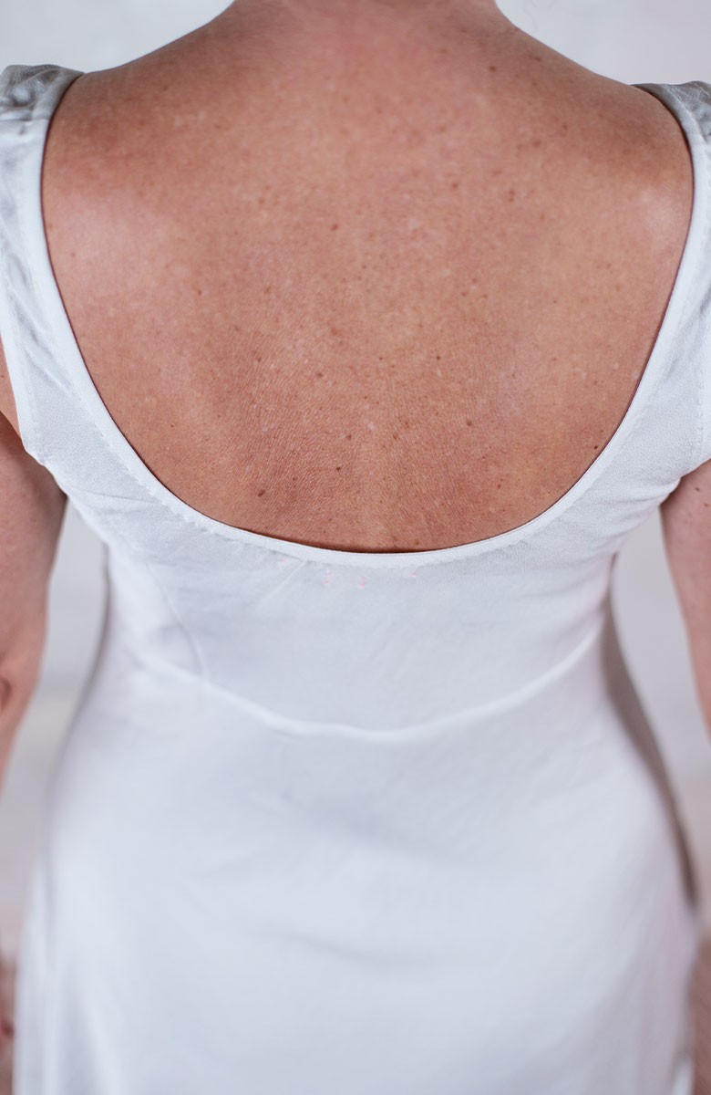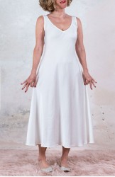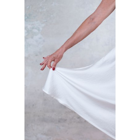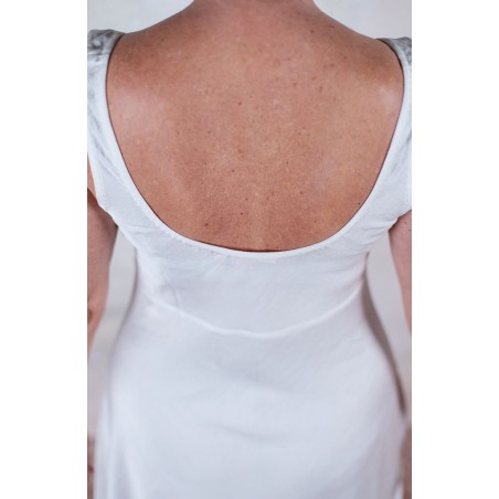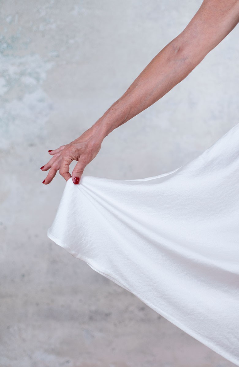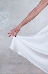 Vestito senza maniche con scollo profondo. Raso tagliato in sbiego, profili rifiniti con punti a mano e fondo tagliato al vivo. E’ l'abito perfetto, scivola fluido e liquido sul corpo e lo asseconda nei movimenti e nelle forme, perché tagliato in sbieco e rifinito con infiniti punti a mano. La scollatura profonda e sapiente è ultra femminile. Pesa pochi grammi. Compagno inseparabile di viaggio, sempre. La versione un po’ più pesante del Perfecto si chiama Nirvana, ed è liquida e lucida. Fluidamente irriverente. Giustamente stropicciata.