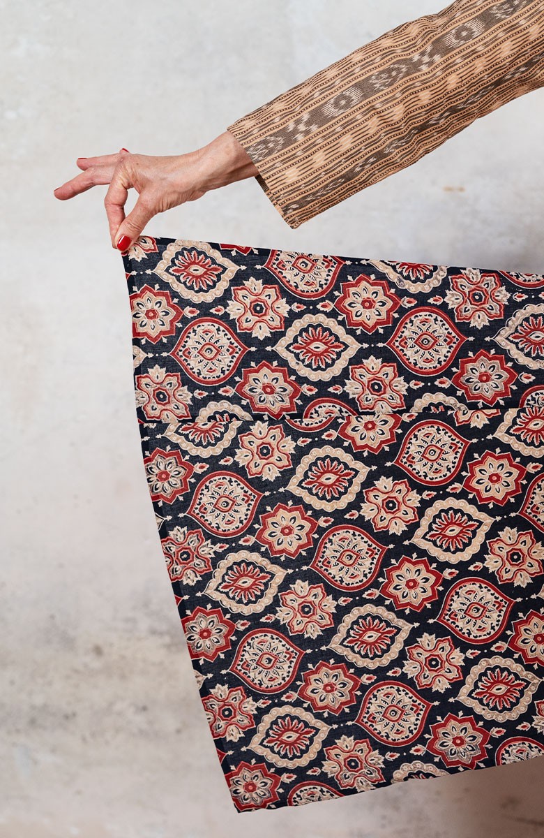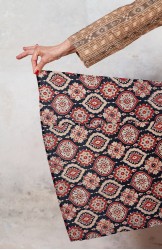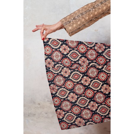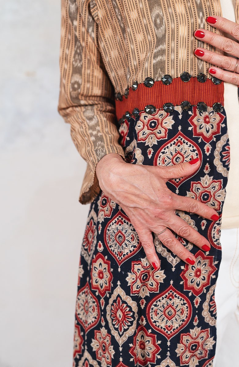 Il disegno del tessuto di cotone della gonna è realizzato con la tecnica manuale ajarak, un’eccellenza indiana, di origine pakistana.