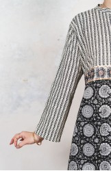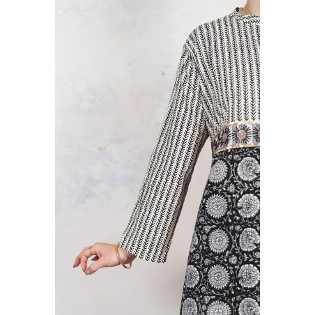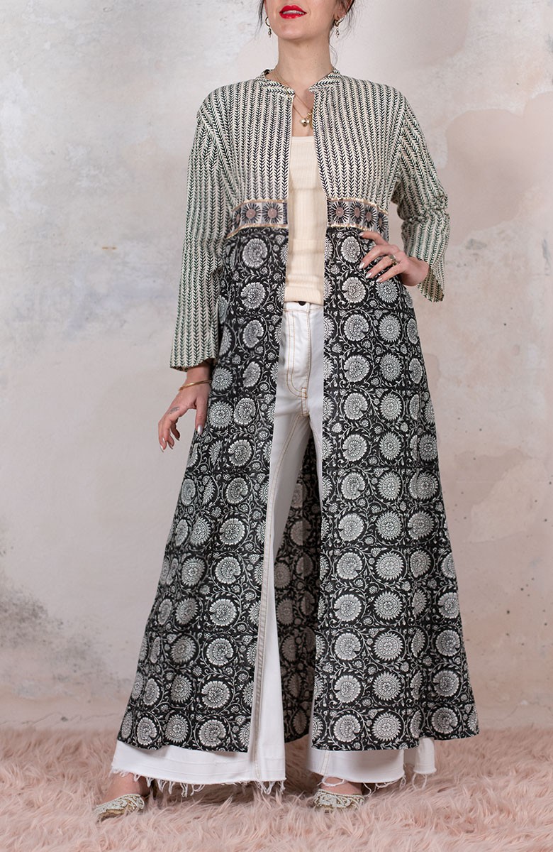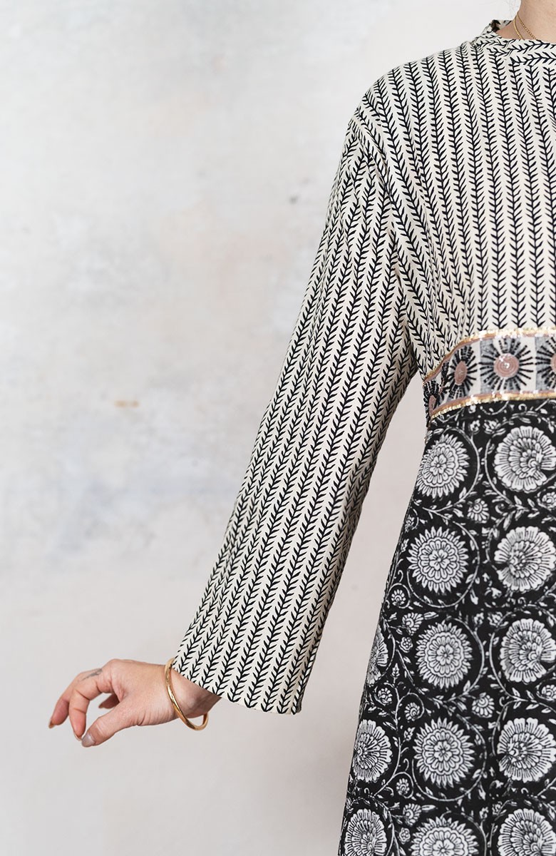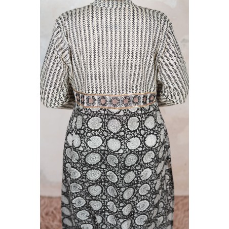 Il tessuto di cotone della gonna è stampato con la tecnica manuale block printing, un’eccellenza indiana.