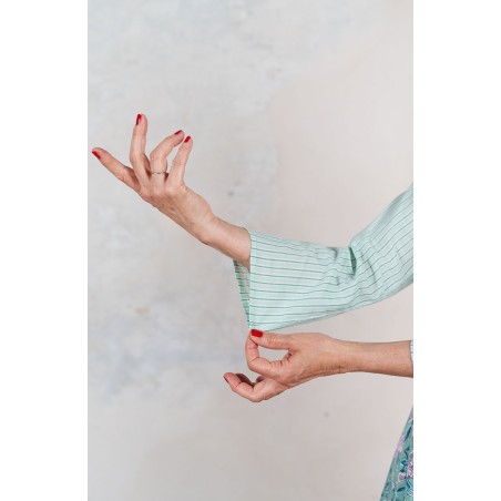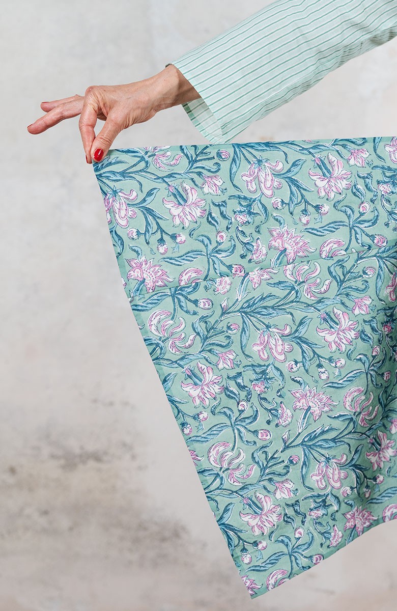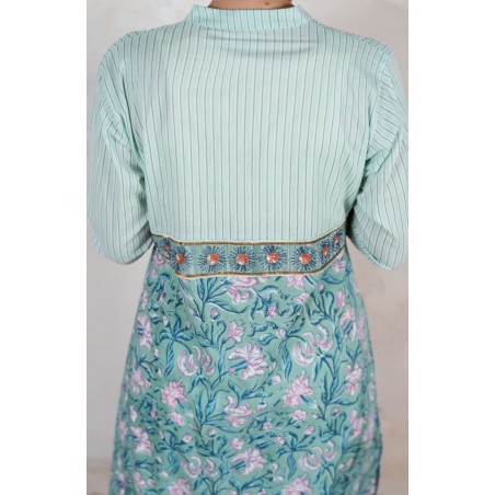 Il tessuto di cotone della gonna e del corpino sono stampati con la tecnica manuale block printing, un’eccellenza indiana.
