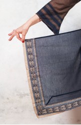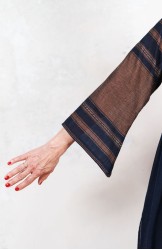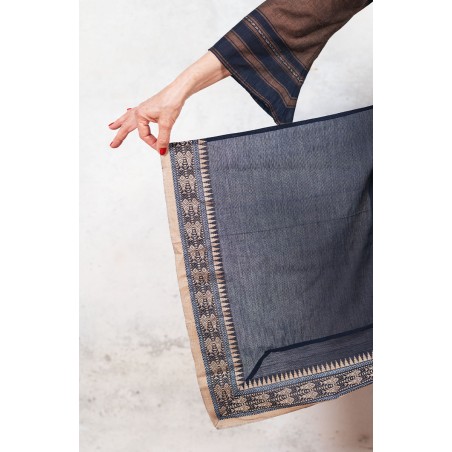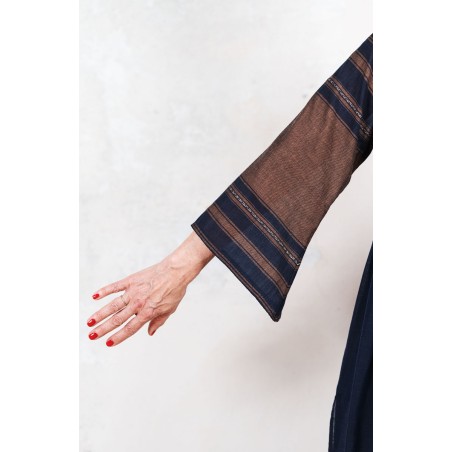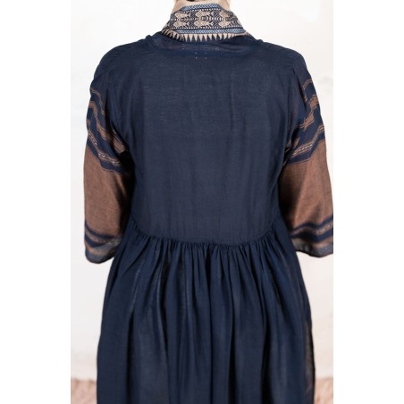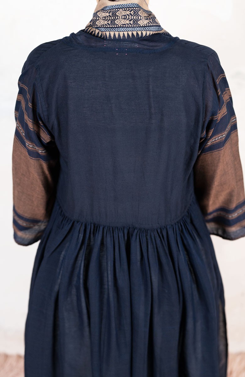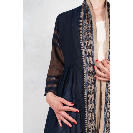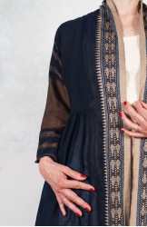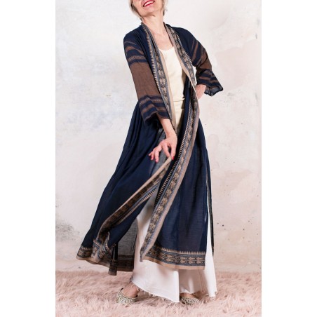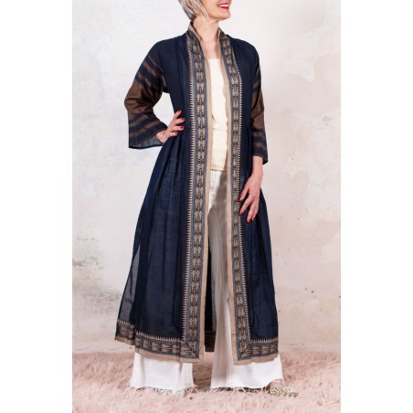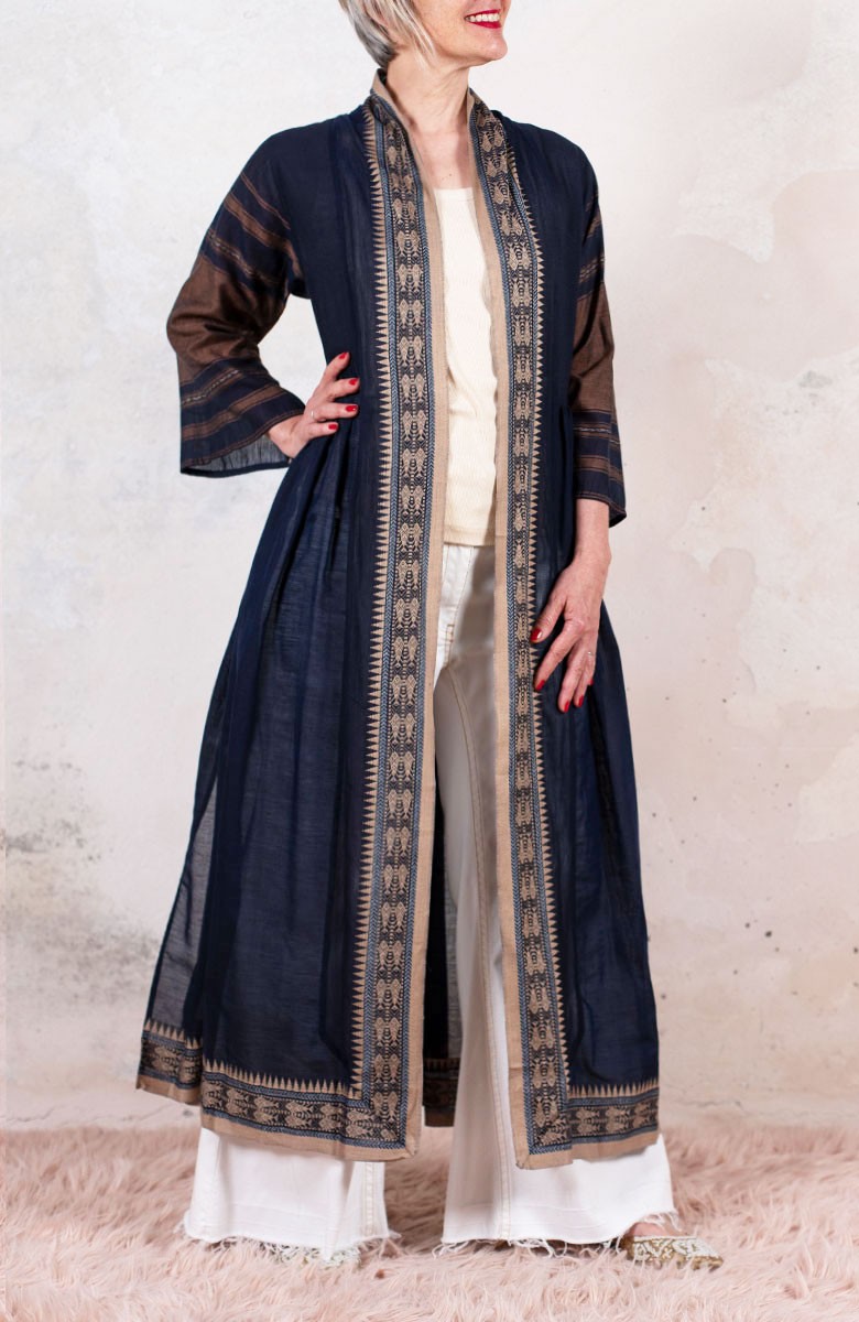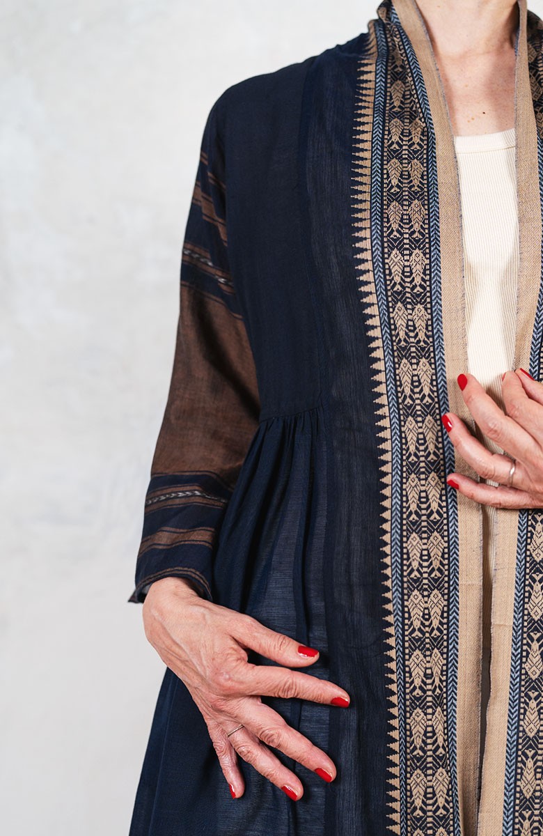 Il tessuto di questo cappottino, con micro inserti di tintura ikat, arriva da un assiduo viaggio di ricerca in India ed è realizzato su telai manuali. È difficile trovare cotoni per sari, lavorati con questa ricercatezza e preziosità, perché solitamente i sari, realizzati per le cerimonie, sono di broccato e non sono morbidi.