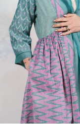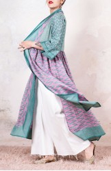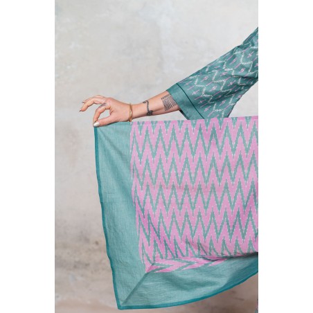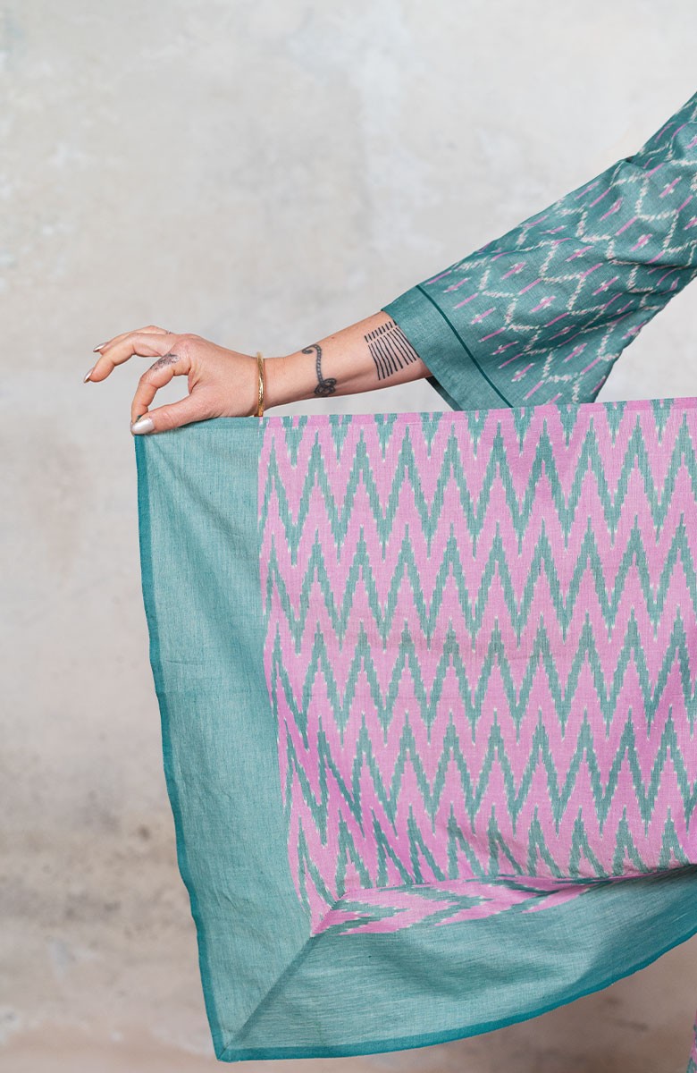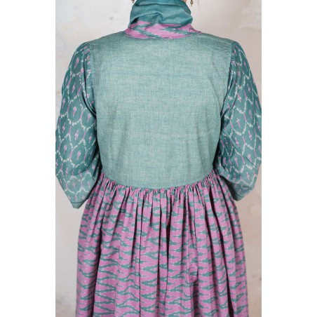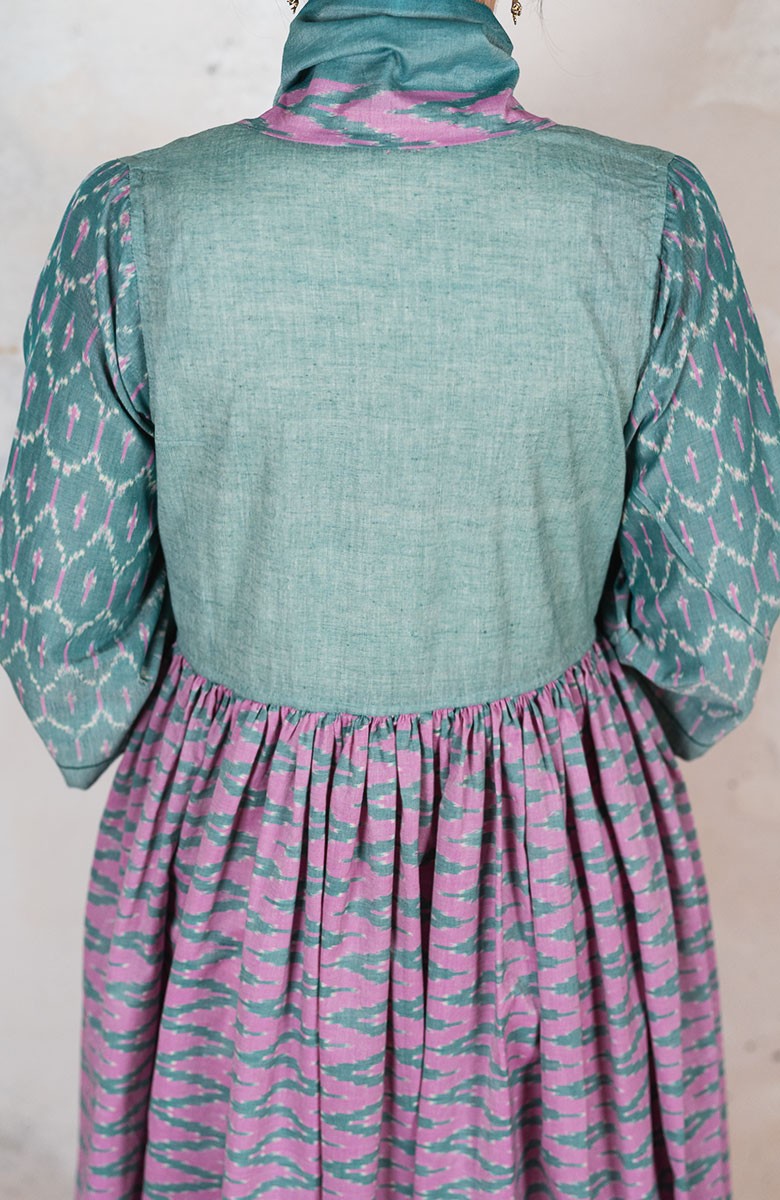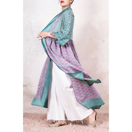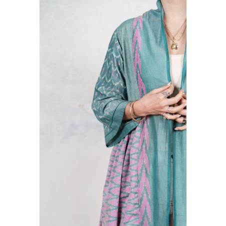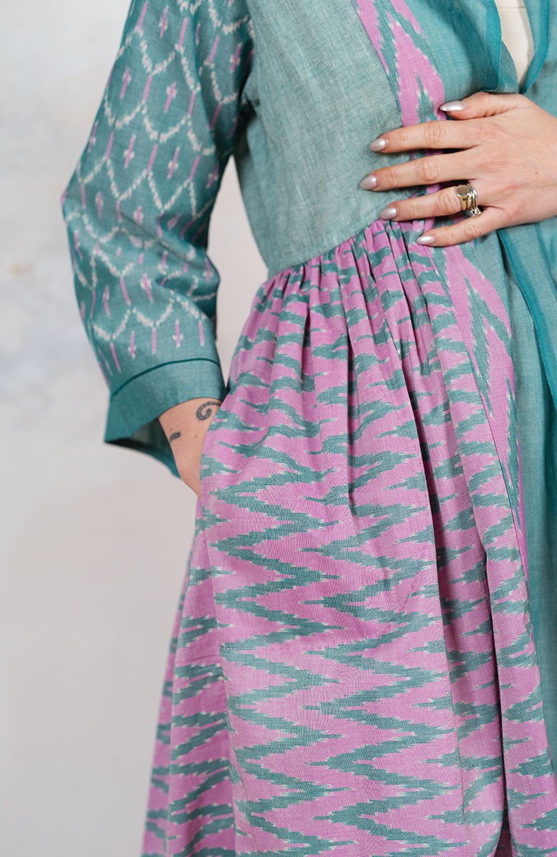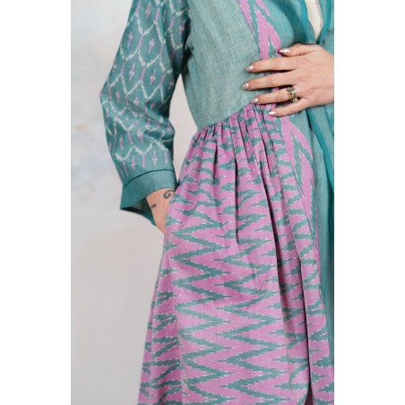Il tessuto di questo cappottino, con micro inserti di tintura ikat, arriva da un assiduo viaggio di ricerca in India ed è realizzato su telai manuali. È difficile trovare cotoni per sari, lavorati con questa ricercatezza e preziosità, perché solitamente i sari, realizzati per le cerimonie, sono di broccato e non sono morbidi.