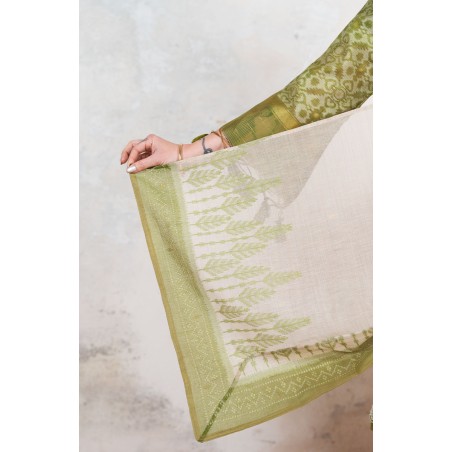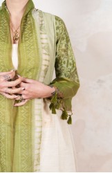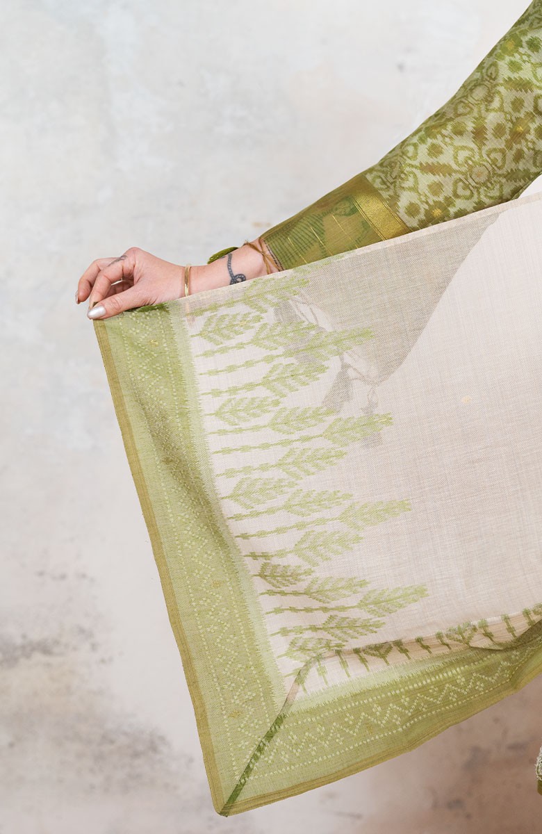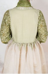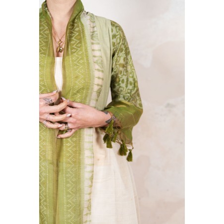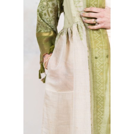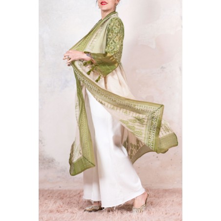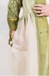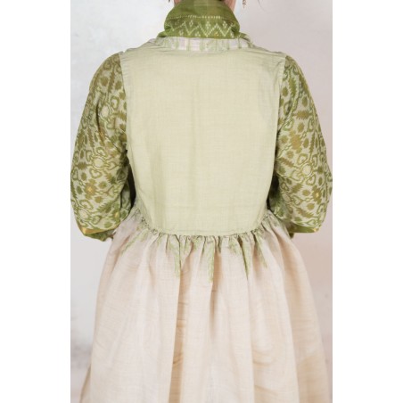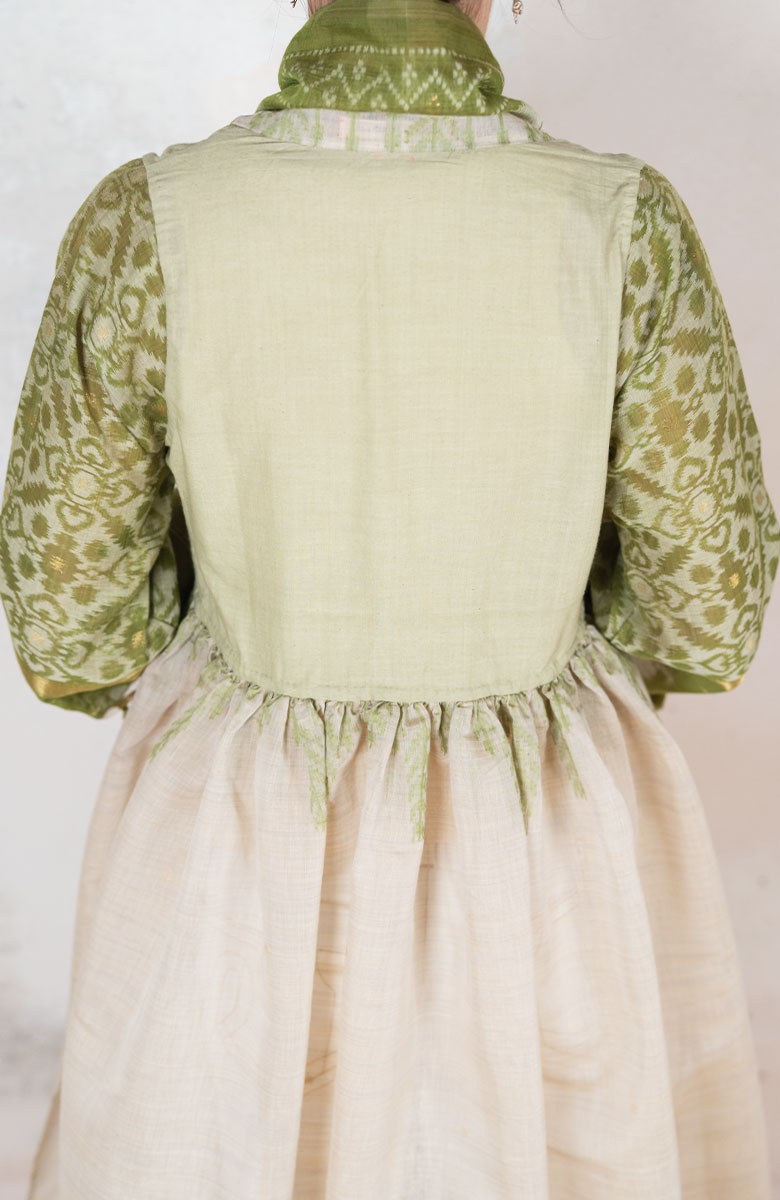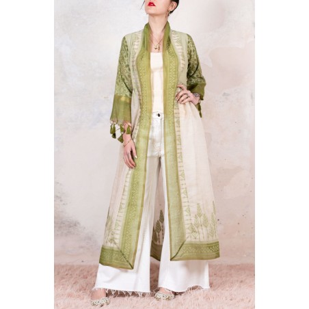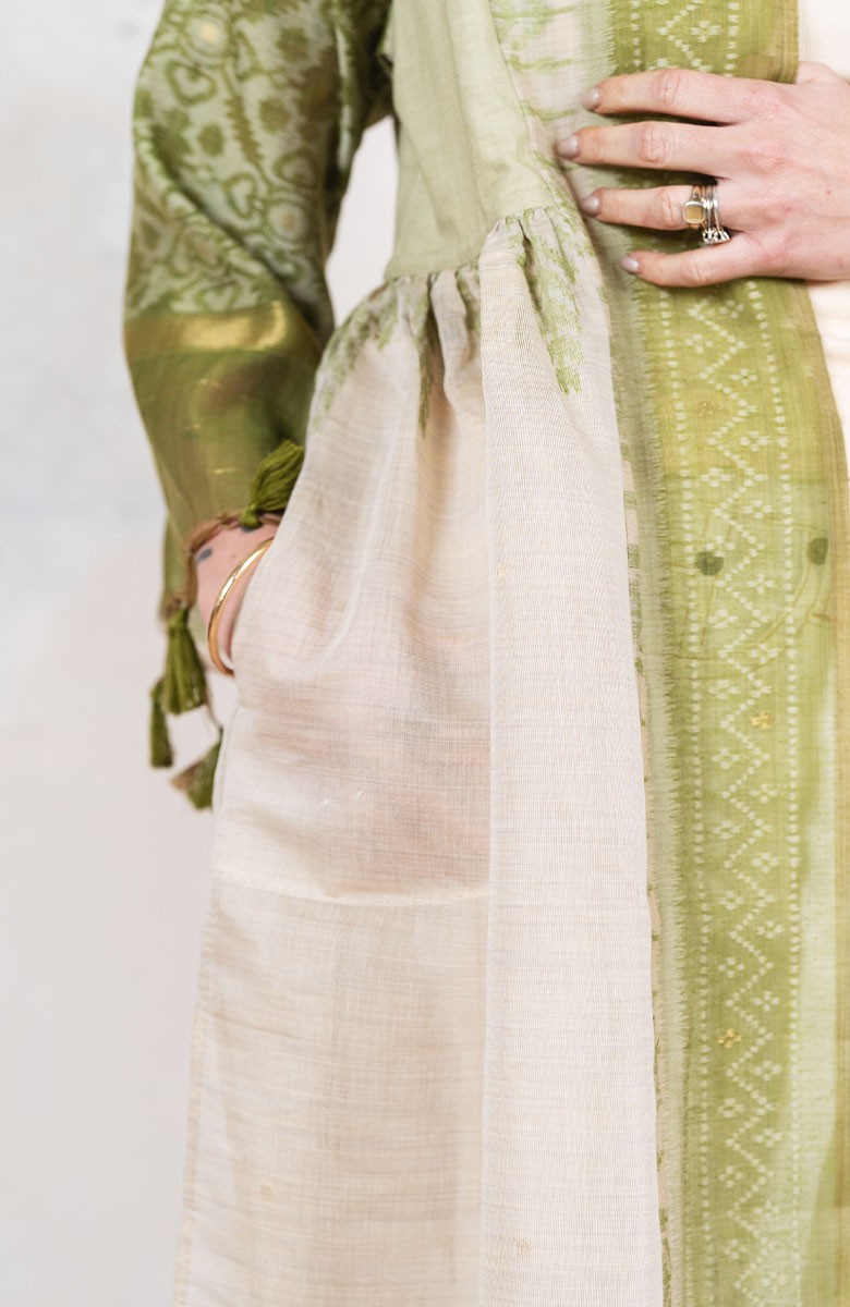 Il tessuto di questo cappottino arriva da un assiduo viaggio di ricerca in India ed è realizzato su telai manuali. È difficile trovare cotoni per sari, lavorati con questa ricercatezza e preziosità, perché solitamente i sari, realizzati per le cerimonie, sono di broccato e non sono morbidi.