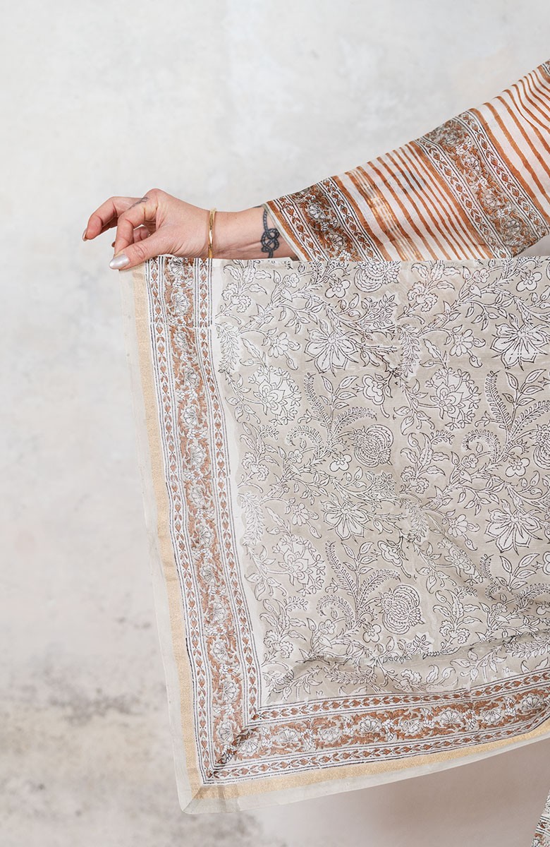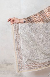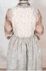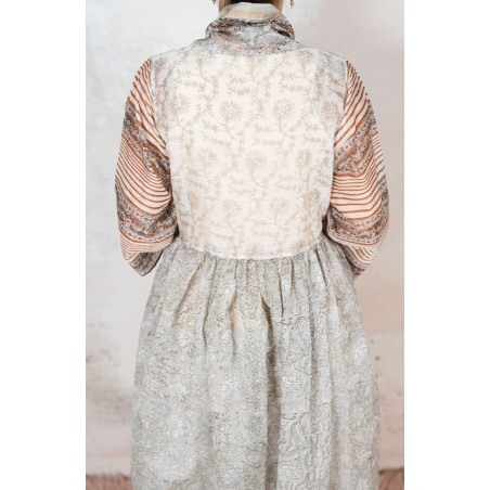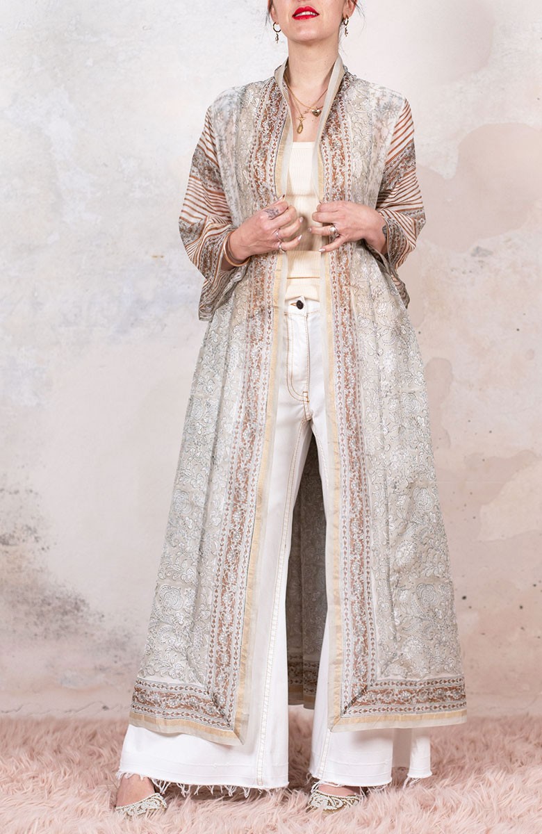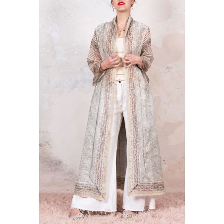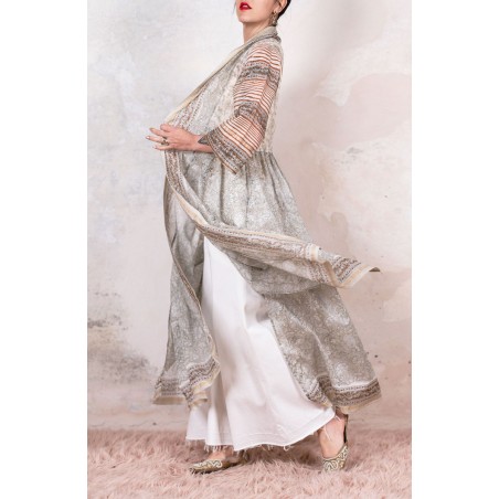 Il tessuto di questo cappottino arriva da un assiduo viaggio di ricerca in India ed è realizzato su telai manuali. È difficile trovare cotoni per sari, lavorati con questa ricercatezza e preziosità, perché solitamente i sari, realizzati per le cerimonie, sono di broccato e non sono morbidi.