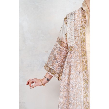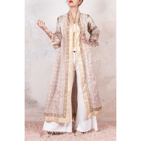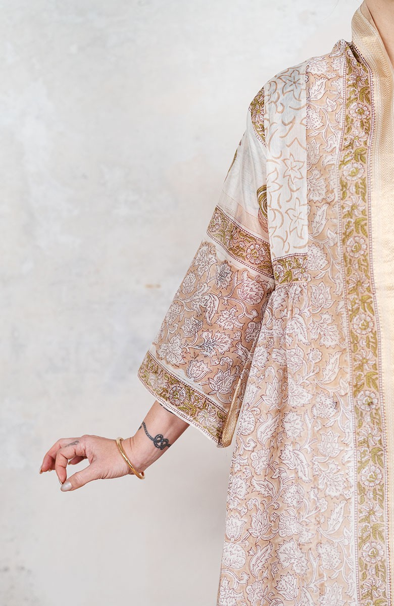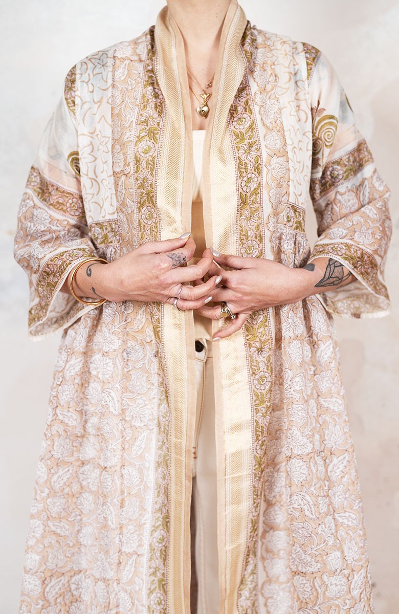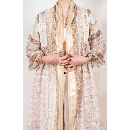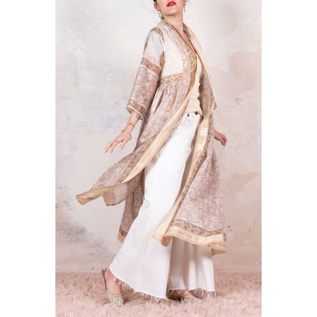 Il tessuto di questo cappottino arriva da un assiduo viaggio di ricerca in India ed è realizzato su telai manuali. È difficile trovare cotoni per sari, lavorati con questa ricercatezza e preziosità, perché solitamente i sari, realizzati per le cerimonie, sono di broccato e non sono morbidi.