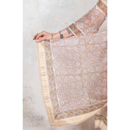 Si tratta di una stampa realizzata con blocchi di legno, intagliati, che vengono immersi nel colore e poi appoggiati sul tessuto per creare il disegno.