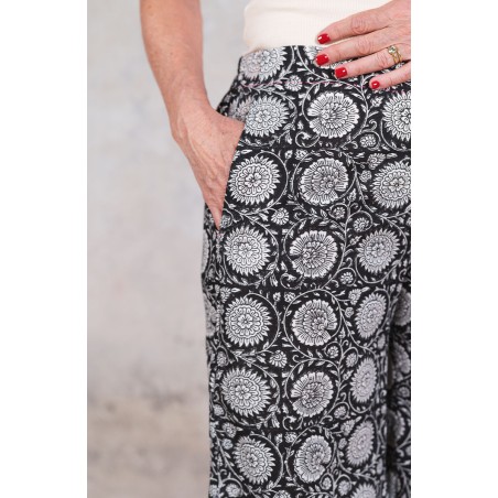 Pant svasato al fondo, in cotone leggerissimo stampato con la tecnica del block print, tecnica manuale di lunga tradizione indiana. Tasche profonde sui fianchi, elastico dietro sul cinturino, piping al fondo, impunture a mano Indian pink in vita, sottopunti a mano e cuciture all’inglese interne. Un pantalone indispensabile per abitare l’estate, ovunque andrai. Un pantalone perfetto per i tuoi viaggi on the road, per i tuoi giorni al mare, per le tue sere sui terrazzi. Per ogni momento del tuo tempo estivo.