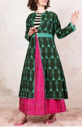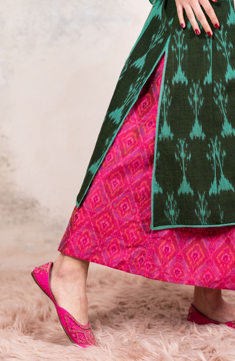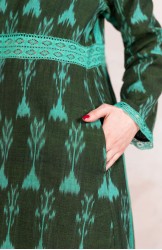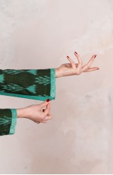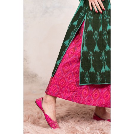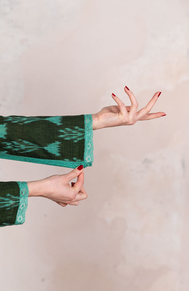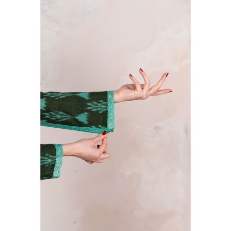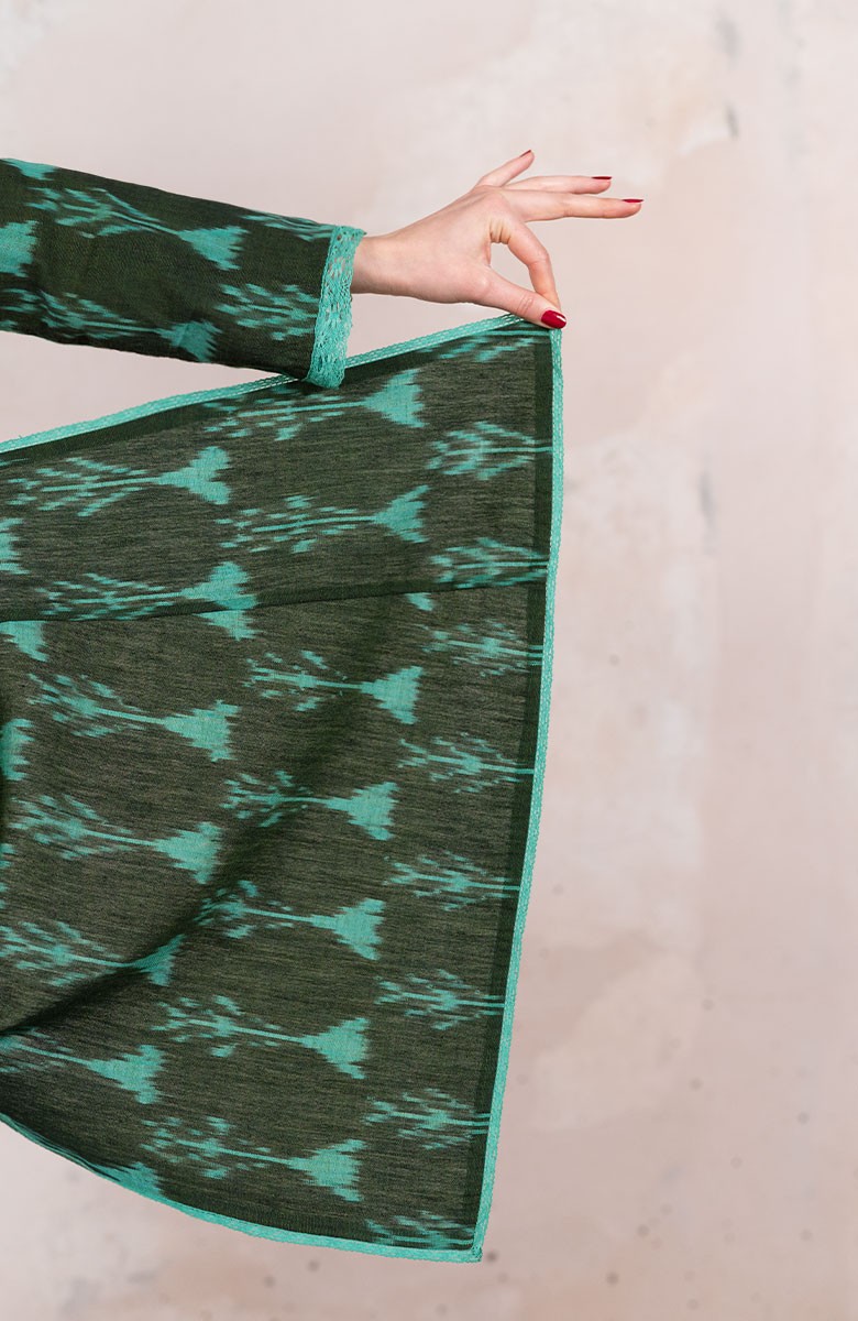 Il suo tessuto di cotone è lavorato con la tecnica di tintura ikat, una delle più antiche al mondo. Si tratta di una tintura a riserva, dove parti dei fili, ancor prima che questi vengano tessuti, sono protette tramite una stretta legatura per non essere tinte, mentre le parti non legate si colorano. Una lavorazione che si realizza, insomma, prima della tessitura; il disegno, poi, che scende dal telaio è pura magia.