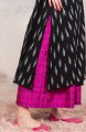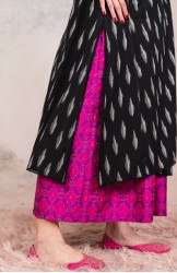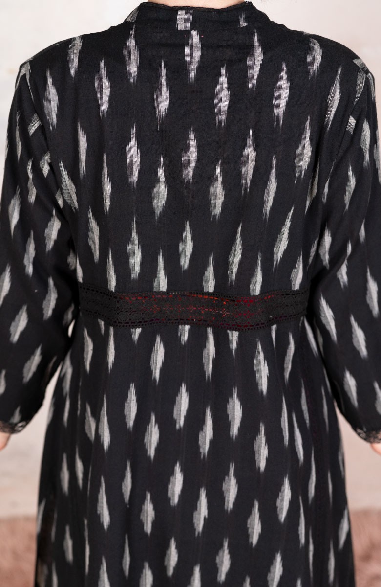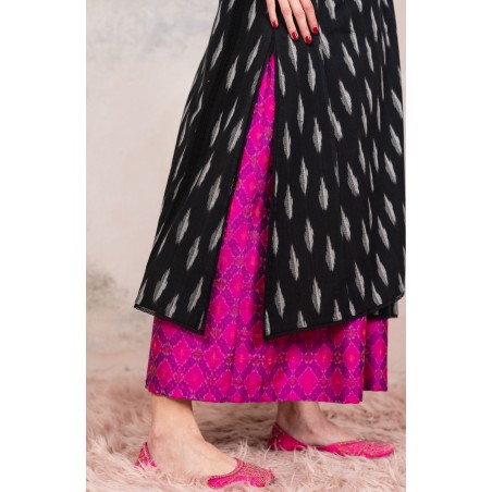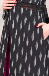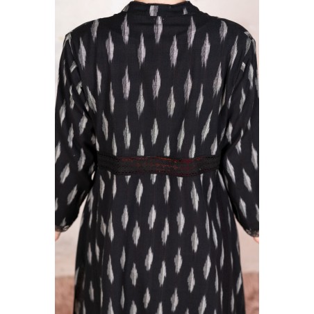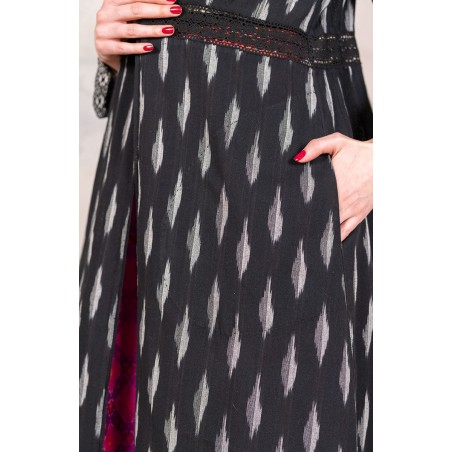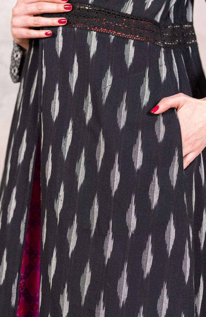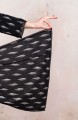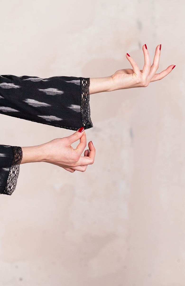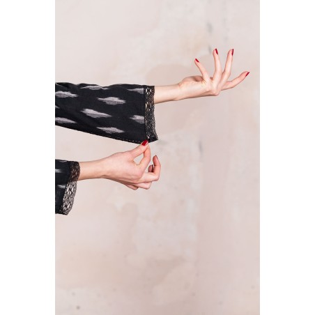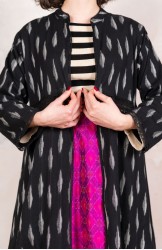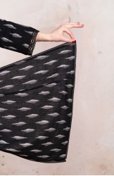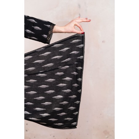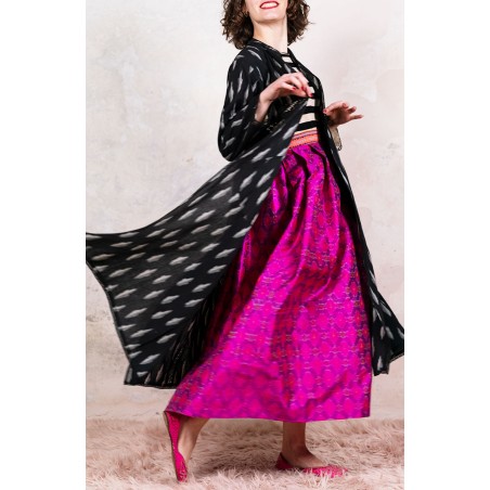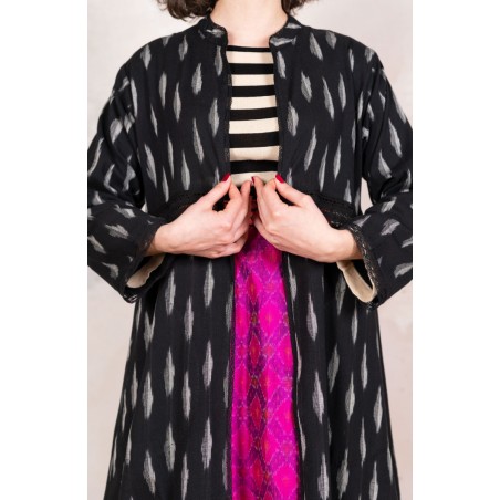 Il suo tessuto di cotone è lavorato con la tecnica di tintura ikat, una delle più antiche al mondo. Si tratta di una tintura a riserva, dove parti dei fili, ancor prima che questi vengano tessuti, sono protette tramite una stretta legatura per non essere tinte, mentre le parti non legate si colorano. Una lavorazione che si realizza, insomma, prima della tessitura; il disegno, poi, che scende dal telaio è pura magia.