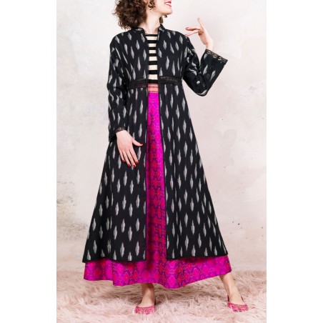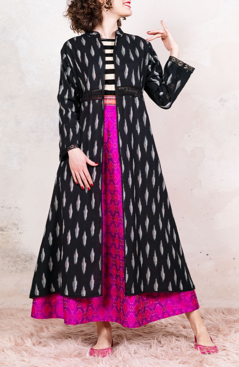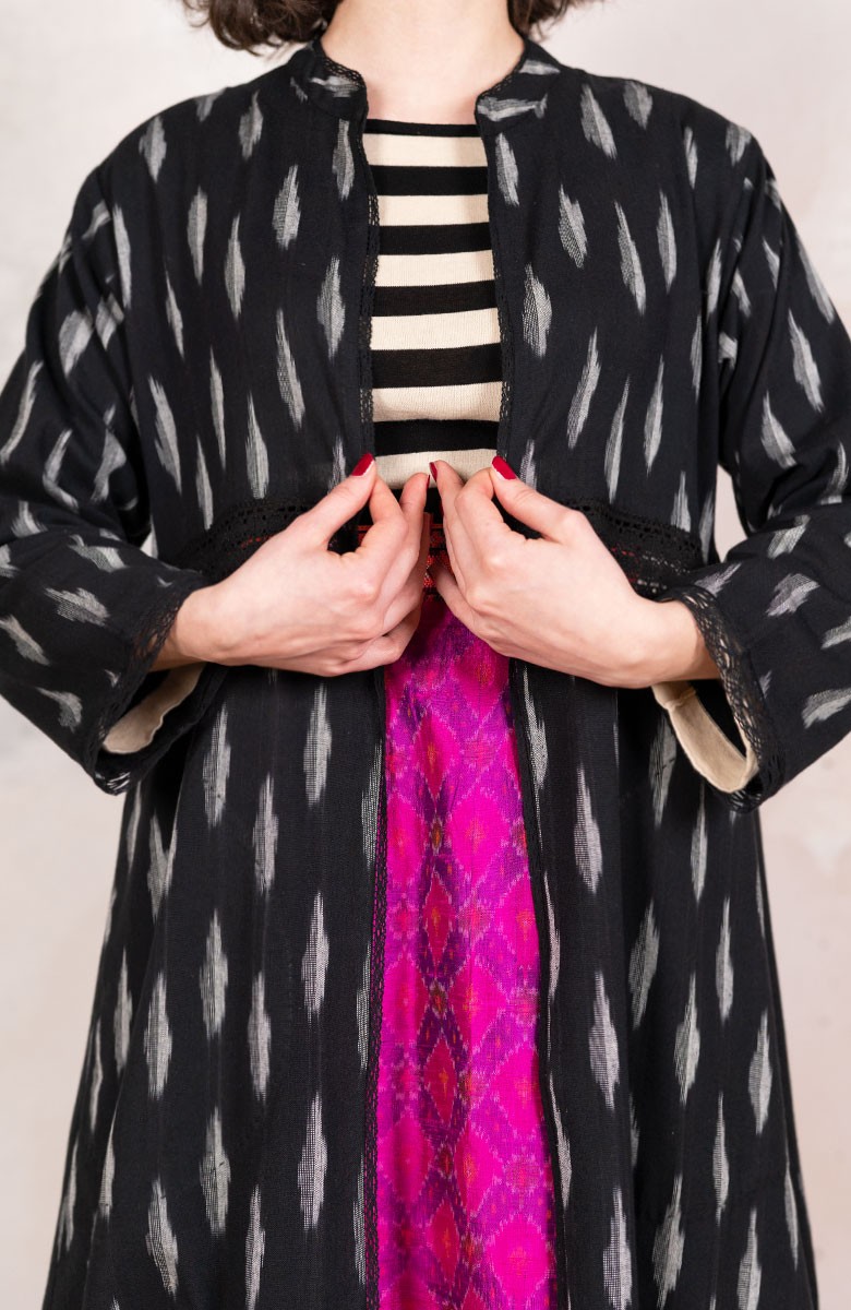 Cappottino leggero, l’ossimoro più amato di Raptus&Rose. Lungo, svasato, con spacchi laterali e tasche profonde, rifinito con metri di punti a mano, e pizzi infinitesimali lungo tutti i suoi perimetri, è il perfetto alleato di ogni valigia e di ogni outfit: dal più eccentrico al più chic, dal più rock al più easy.