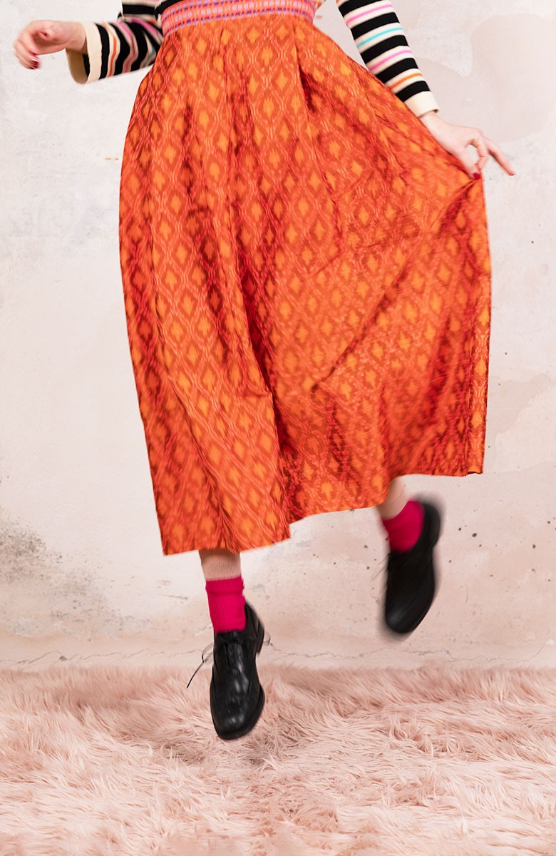 La seta della Gonna Volante è stata acquistata durante un viaggio di ricerca in India.