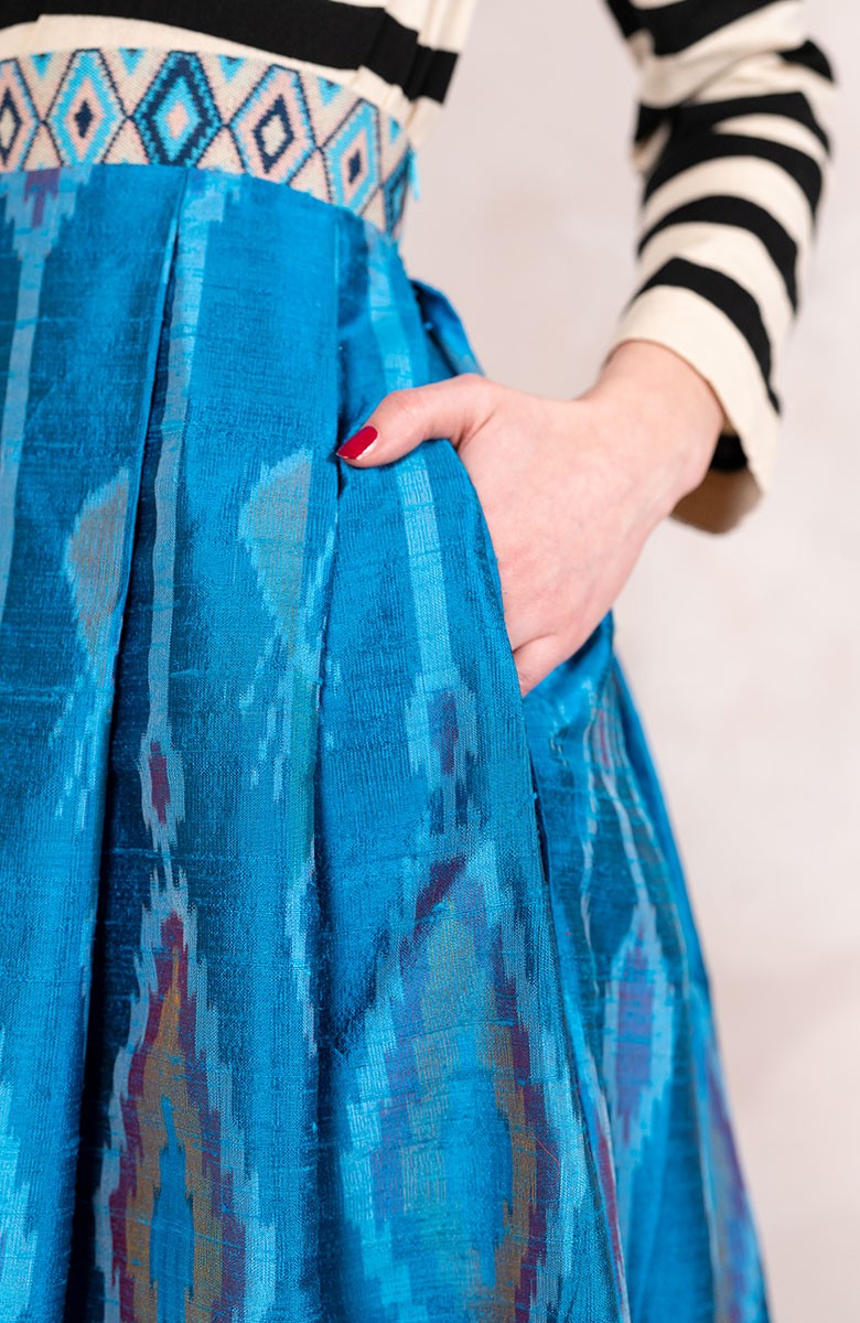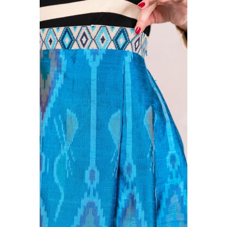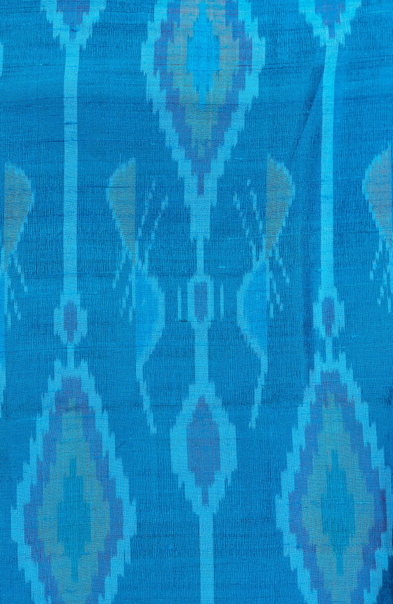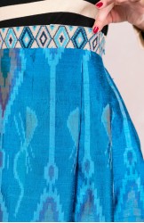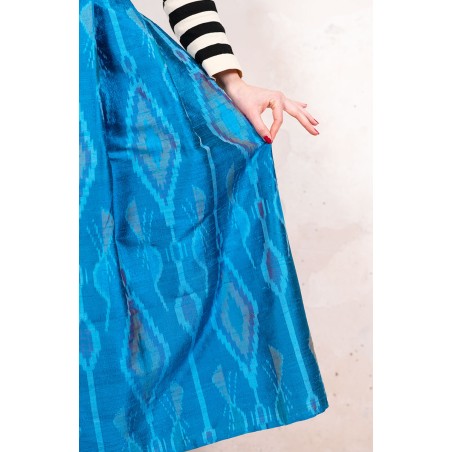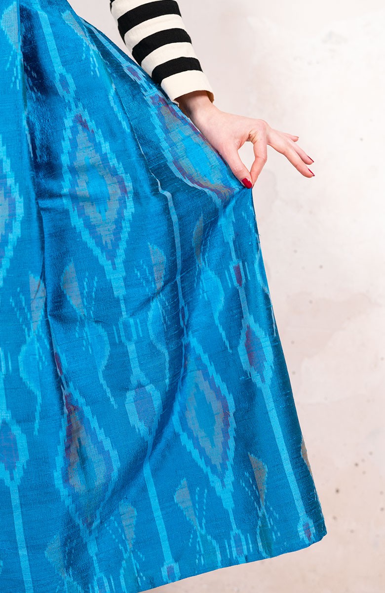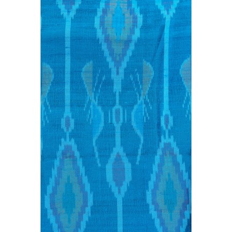 Il suo tessuto 100% seta è lavorato con la tecnica di tintura ikat, una delle più antiche al mondo.