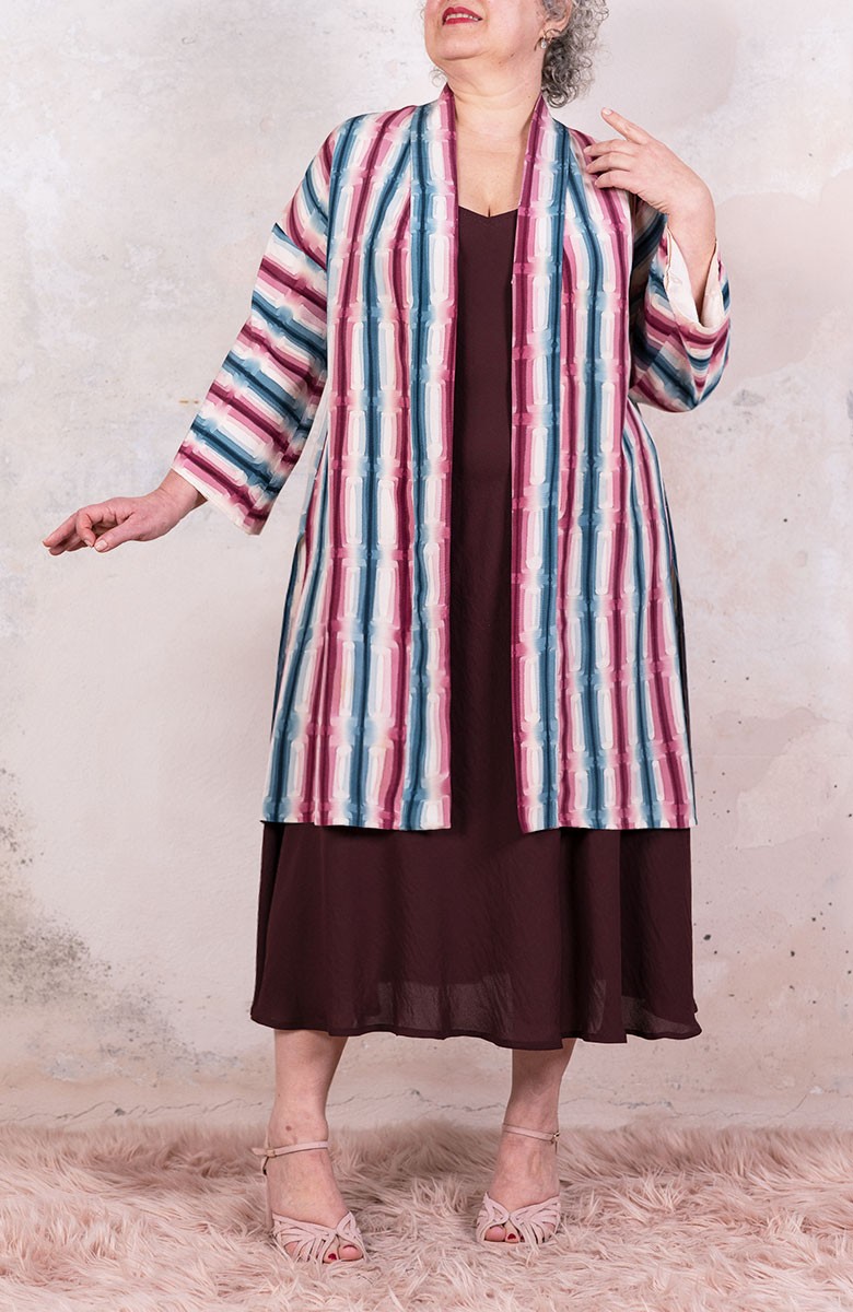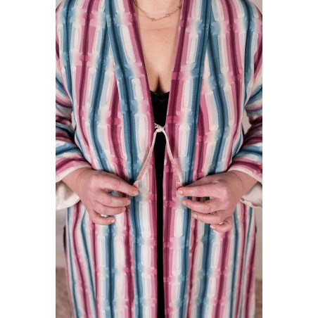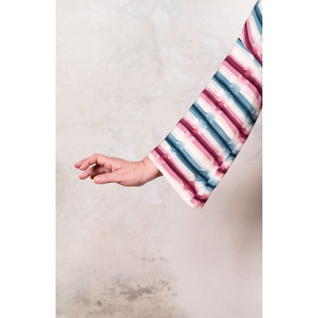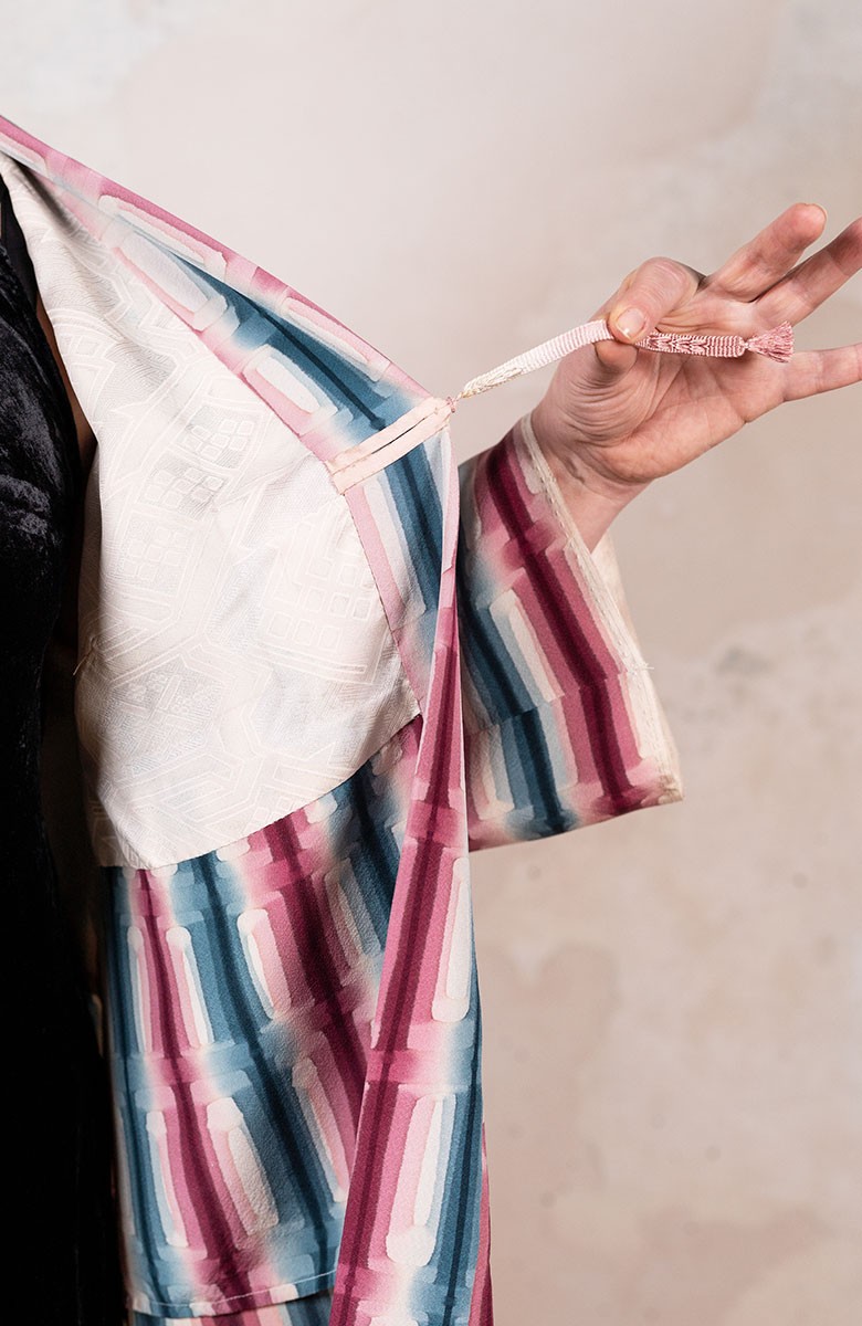 Il tessuto è il famoso e prezioso crespo di seta lavorato jacquard e stampato con delicate geometrie e armonie cromatiche, tipiche della grazia giapponese.