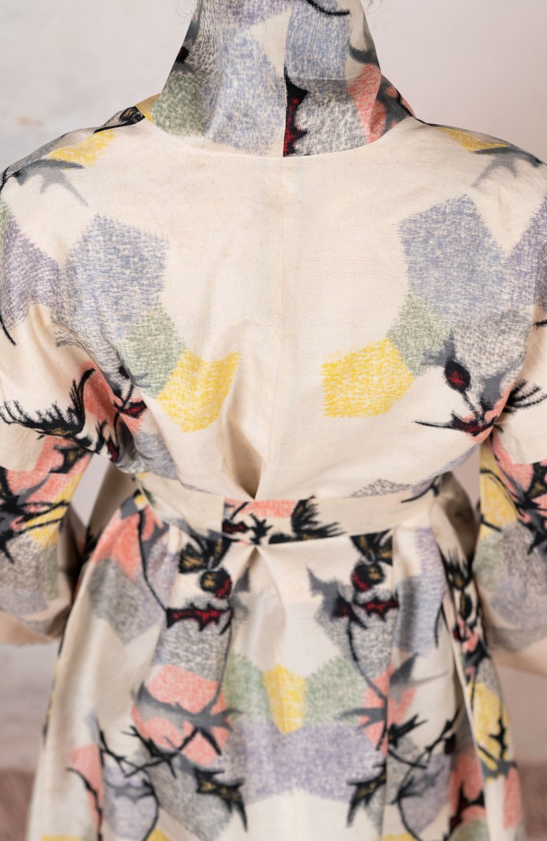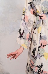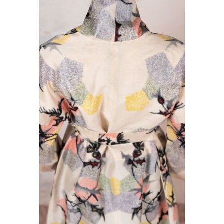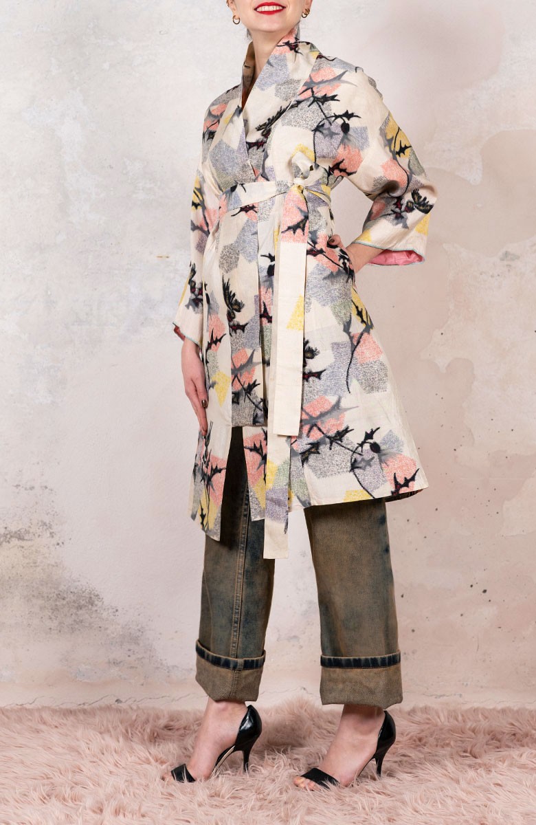 Ibrido magnifico tra Oriente ed Occidente. Cappottino nella più pura tradizione Raptus, con dentro tutta la storia di un Haori autentico. Un piccolo miracolo sartoriale ottenuto con il posizionamento del cartamodello tutto Raptus sull’haori e salvando ogni dettaglio: dal tessuto tolto da una parte delle maniche originali e usato per fare il sacco tasca del nuovo European Kimono, alla seta del rivestimento interno. E chilometri di punti a mano. L’interno è una sorpresa poetica di seta - nella filosofia giapponese, la Bellezza nascosta è quella più preziosa, da proteggere.