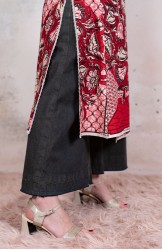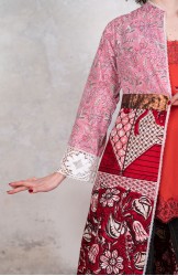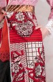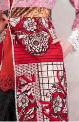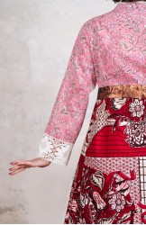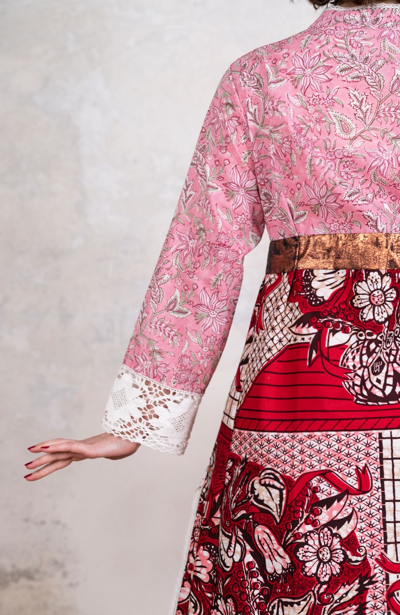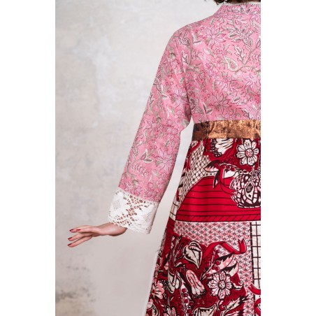 Il tessuto del corpino è di cotone, stampato con la tecnica del block printing: il disegno desiderato viene intagliato in blocchi di legno, i quali vengono immersi nel colore e poi appoggiati sul tessuto.