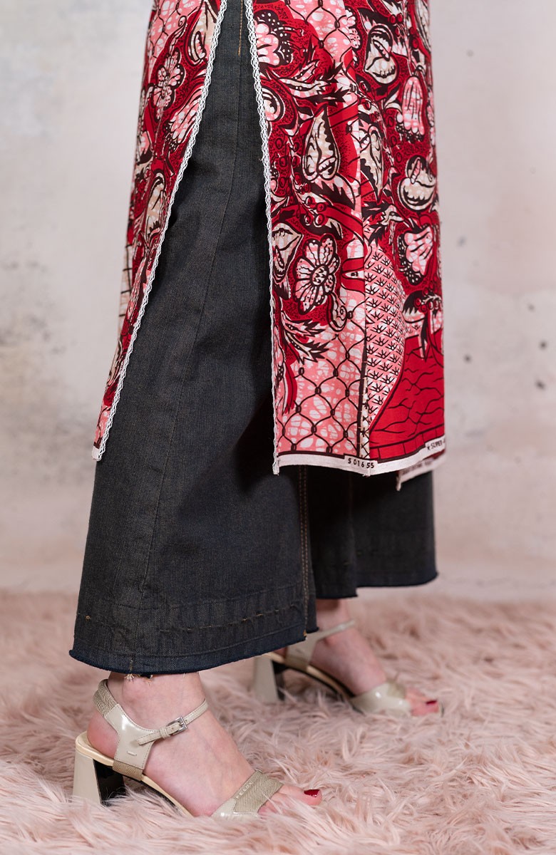Il tessuto della gonna è di cotone, lavorato con la tecnica di tintura a cera (wax). Si tratta di una tintura a riserva: la cera viene sciolta e poi modellata sul tessuto da tingere. Quindi il tessuto è imbevuto di colore, a cui la cera impedisce di coprire il disegno. Il processo di ceratura e ammollo viene ripetuto per ogni colore.