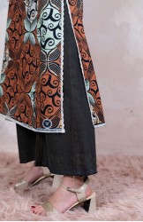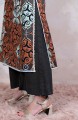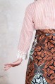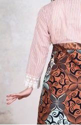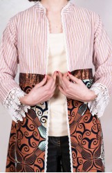 Il tessuto del corpino è di cotone, stampato con la tecnica del block printing: il disegno desiderato viene intagliato in blocchi di legno, i quali vengono immersi nel colore e poi appoggiati sul tessuto.