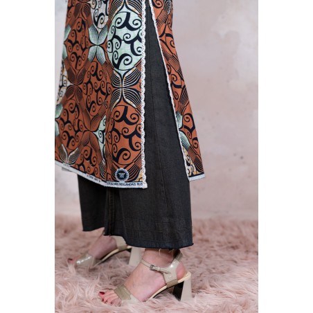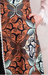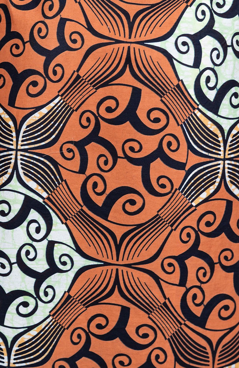 Il tessuto della gonna è di cotone, lavorato con la tecnica di tintura a cera (wax). Si tratta di una tintura a riserva: la cera viene sciolta e poi modellata sul tessuto da tingere. Quindi il tessuto è imbevuto di colore, a cui la cera impedisce di coprire il disegno. Il processo di ceratura e ammollo viene ripetuto per ogni colore.