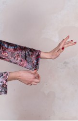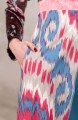 Il tessuto della gonna è seta in ordito e cotone in trama, lavorato con la tecnica di tintura ikat, una delle più antiche al mondo. Si tratta di una tintura a riserva, dove parti dei fili, ancor prima che questi vengano tessuti, sono protette tramite una stretta legatura per non essere tinte, mentre le parti non legate si colorano. Una lavorazione che si realizza, insomma, prima della tessitura; il disegno, poi, che scende dal telaio è pura magia.