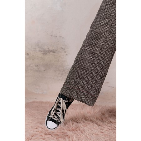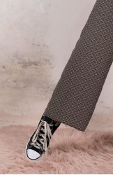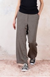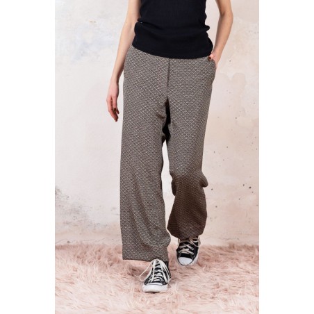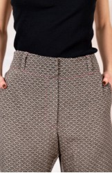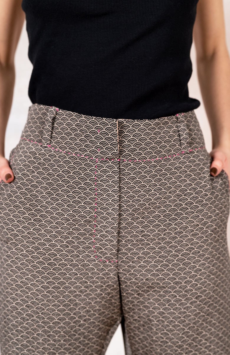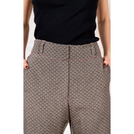 Ispirato al pantalone da lavoro da uomo, ma ricostruito attraverso volumi, proporzioni e dettagli iperfemminili, è il pantalone che va indossato con un'attitudine rilassata, a vita bassa, un po' baggy. Ha la gamba dritta, l'elastico dietro, le tasche profonde la patta e i passanti per la cintura. Il cinturino, gli orli e la patta sono rifiniti con filze fatte a mano, la zip è stata tolta e i 2 bottoni automatici sono cuciti a mano. Un dettaglio importantissimo e per nulla scontato è il taglio lungo il fianco. Non è dritto, ma ruotato. Parte dal bacino davanti e arriva al fondo dietro. È una linea studiata al millimetro che veste la gamba, abbracciandola: armonia perfetta.